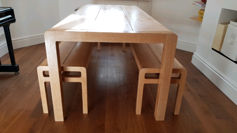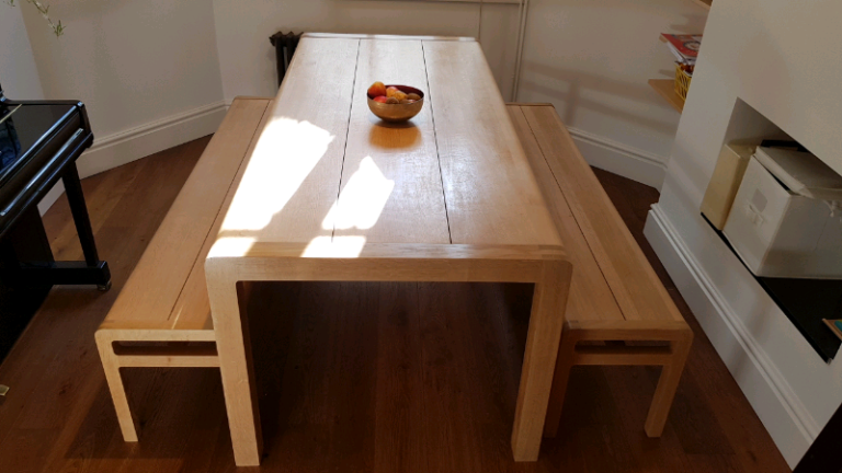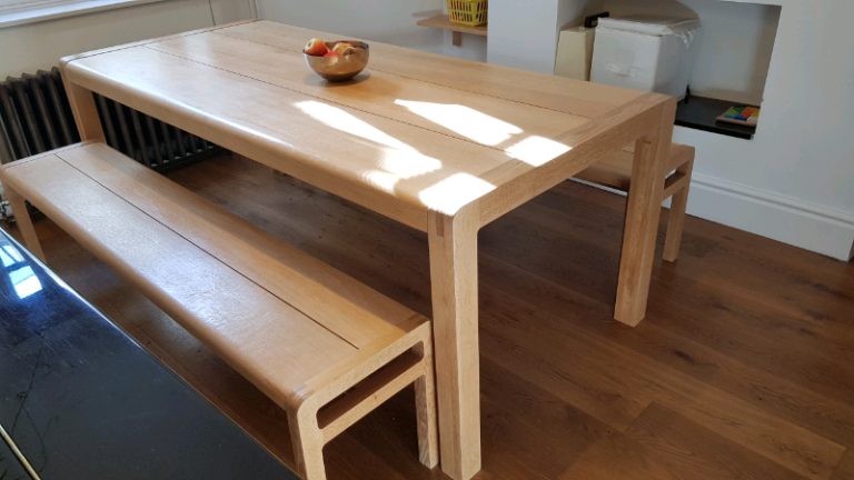 Beautifully and exclusively designed by award winning designer Simon Pengelly for Habitat, this timeless, simple dining set is made out of heavy, solid oak and is in absolutely exceptional condition with barely a mark to be seen throughout all three pieces.