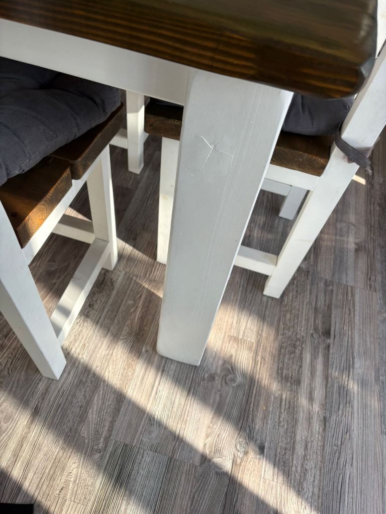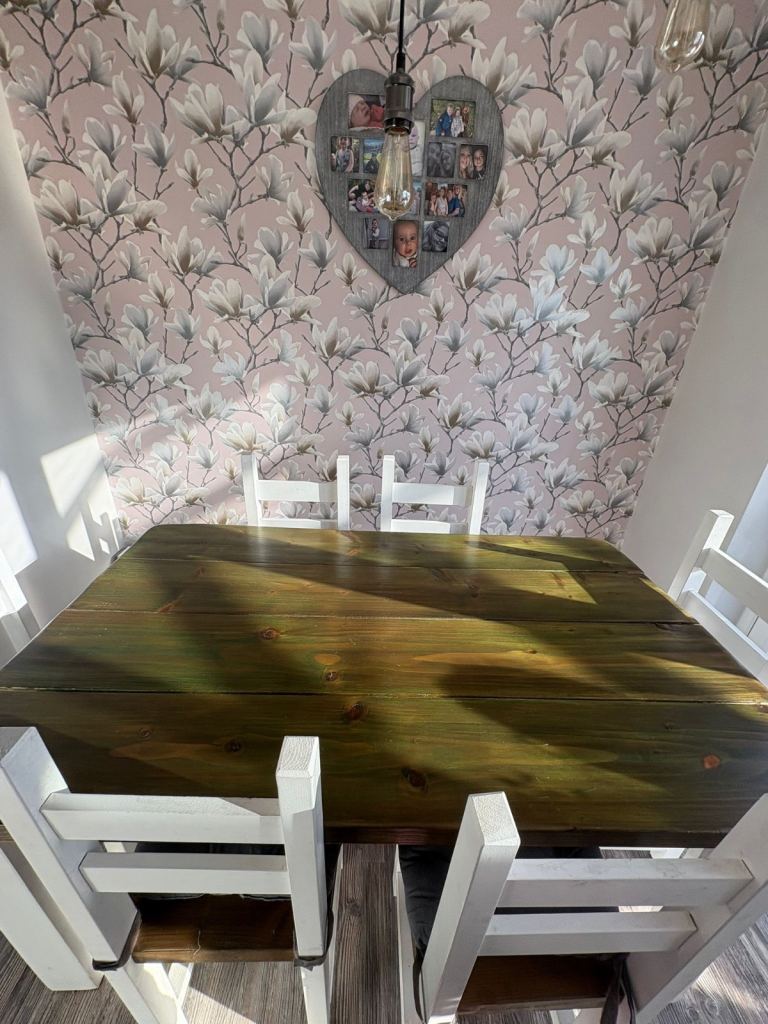 6 seater dining table. handmade. good condition with some marks. ideally would benefit from revarnish.