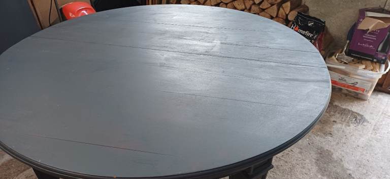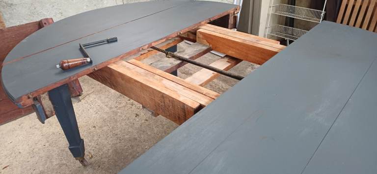 Mahogany wind-out Dining Table. Sold as a round table and has a centre leaf also (but needs slight adjustment to fit in). It exudes old world charm and elegance. Has been professionally stripped and given a contemporary finish in eggshell Top Hat (Fired Earth)