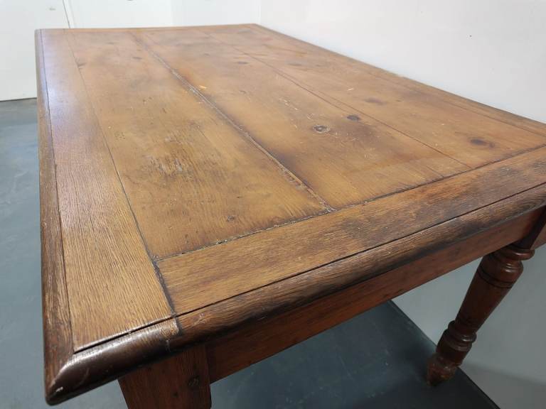 Antique wooden dining table with turned legs and brass handles.