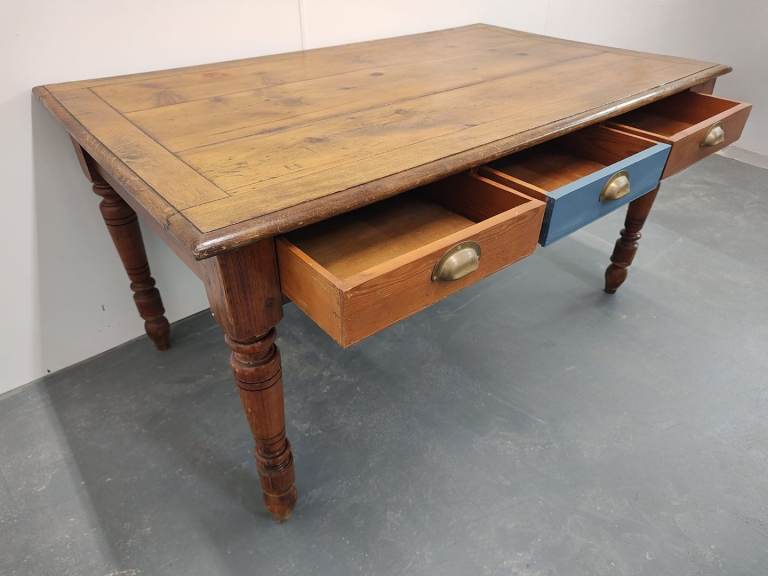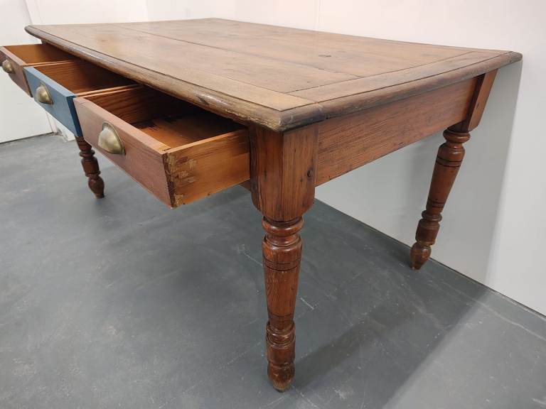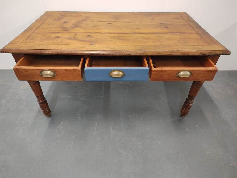 The top of the table has a lovely, natural wood grain and patina. The base is constructed from the same wood with the addition of one of the three drawers being painted blue as a contrasting feature.