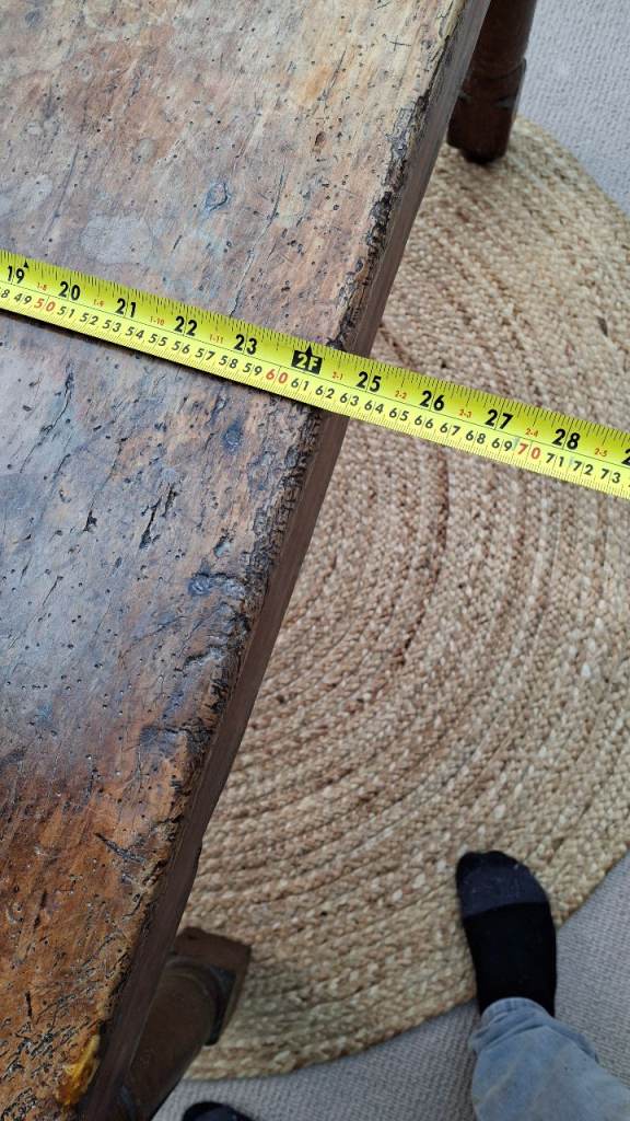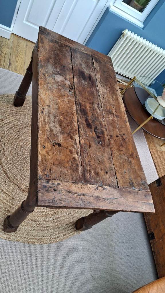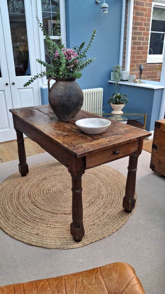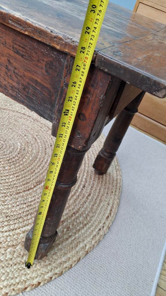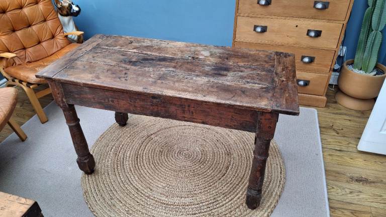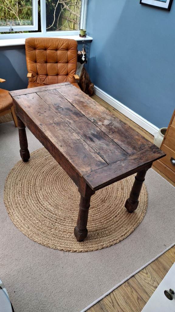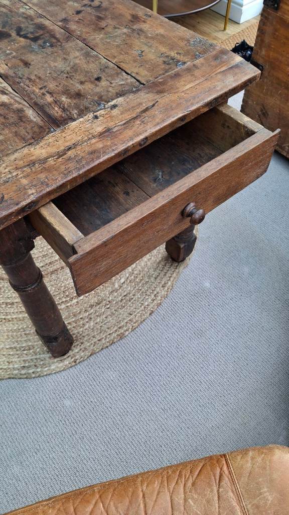 A beautiful table that is over 100 years old. It has had a tough life, but it is still a lovely table with stunning patina. Shows past signs of woodworn (no current woodworn) where it was once stored outside. Priced accordingly due to the wear and tear.