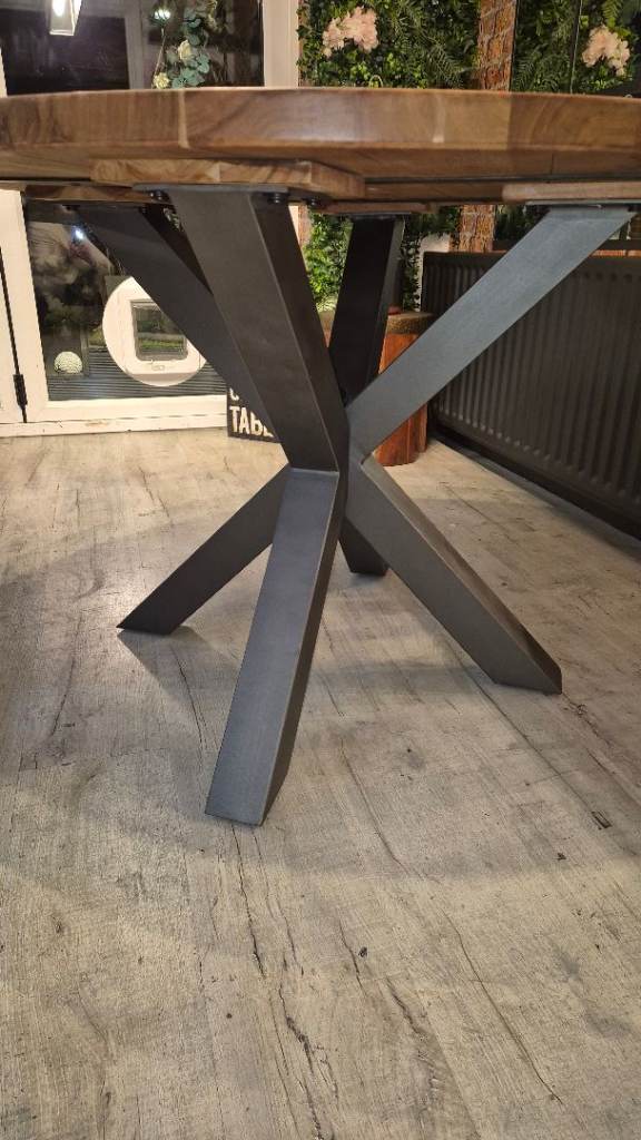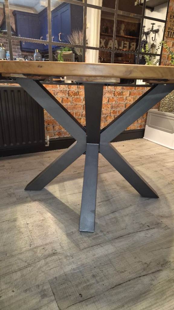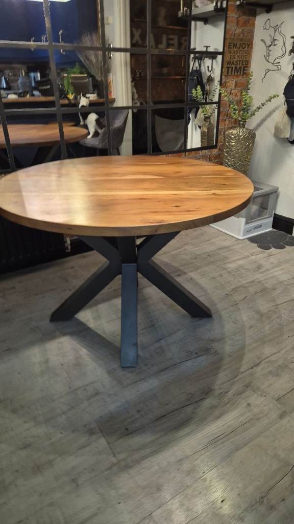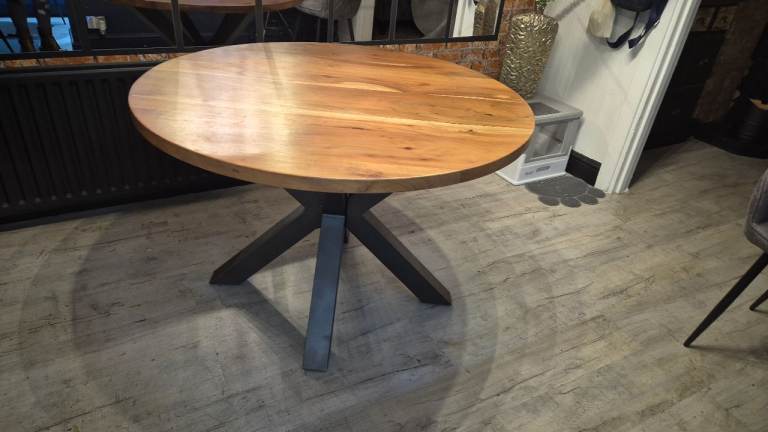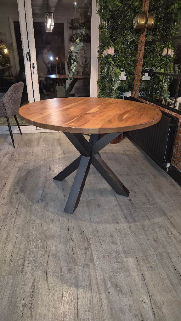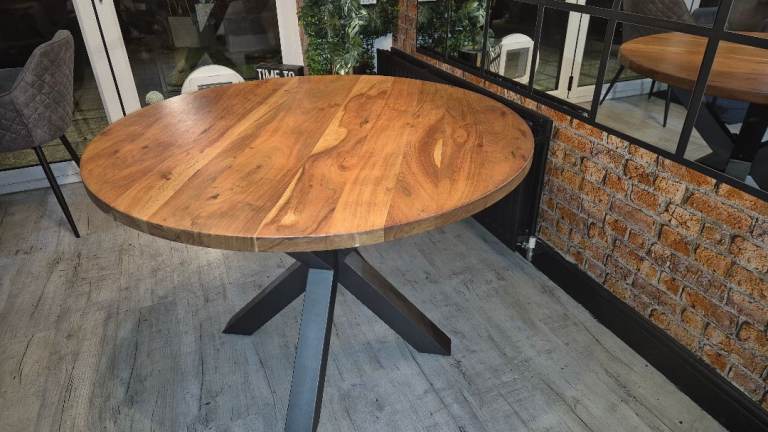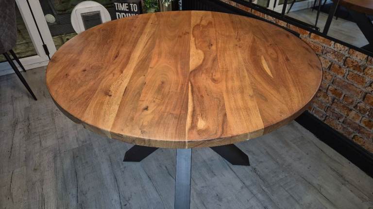 Beautiful round dining table from Barker and Stonehouse, crafted from solid wood. This exquisite piece is in great condition. The table features a robust metal base with a distinctive crossover design. As anticipated from a product of this caliber, it is exceptionally heavy and of superior quality. The table measures 110cm in diameter and can be disassembled for more convenient transportation. Collection is available from Houghton-le-Spring, DH4 area. Alternatively, local delivery can be arranged for an additional fee. Should delivery be requested, we can transport the item to your garden, from where you can then move it into your residence.