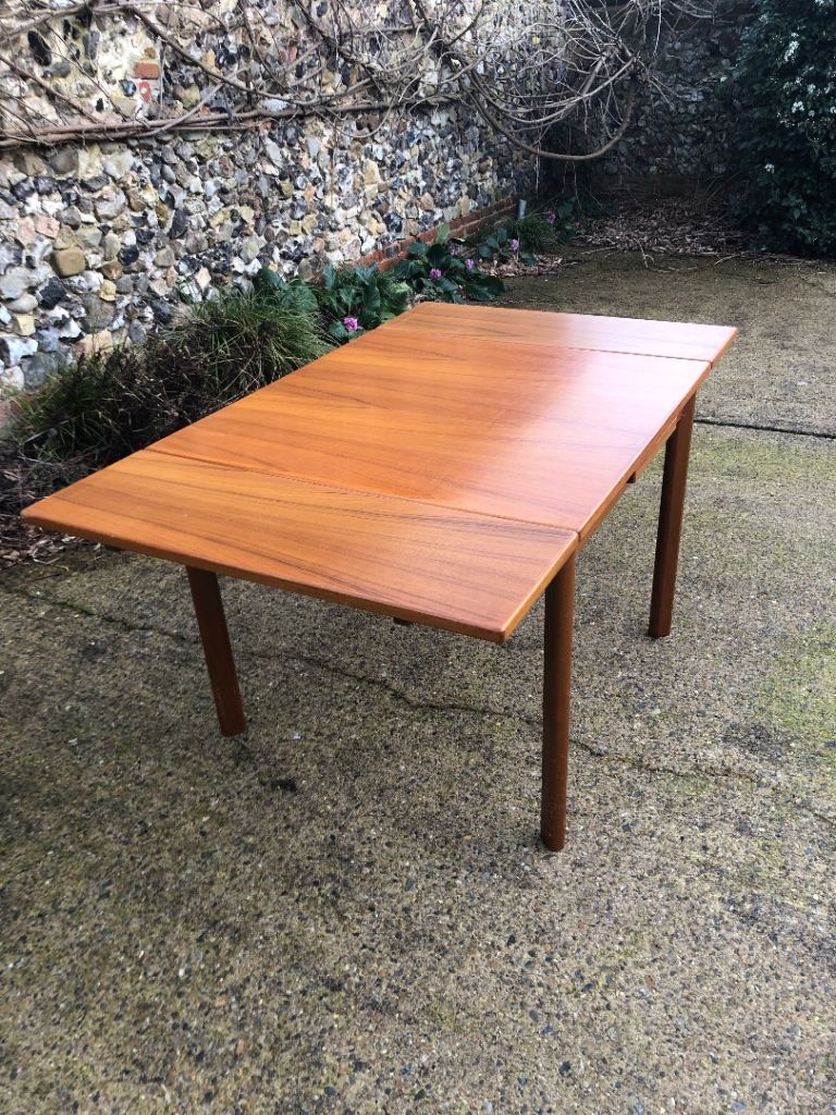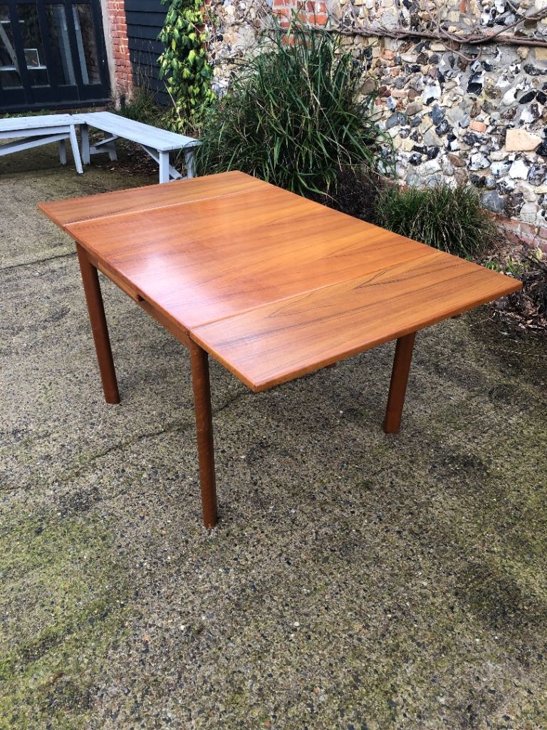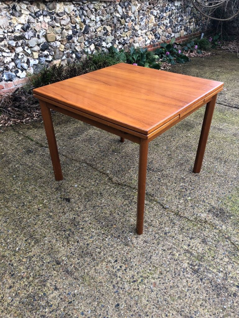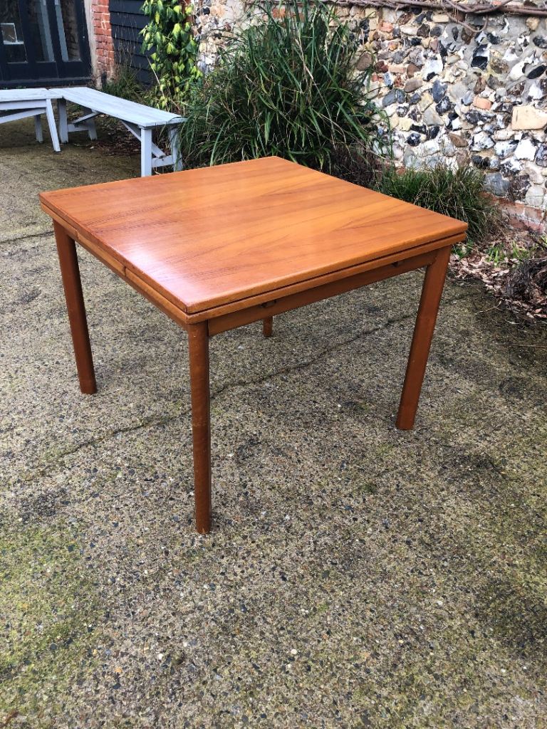 Lovely Mid Century square teak extending dining table. Seats up to 6 people, leaves pull out at the sides easily, legs can be removed for transport.