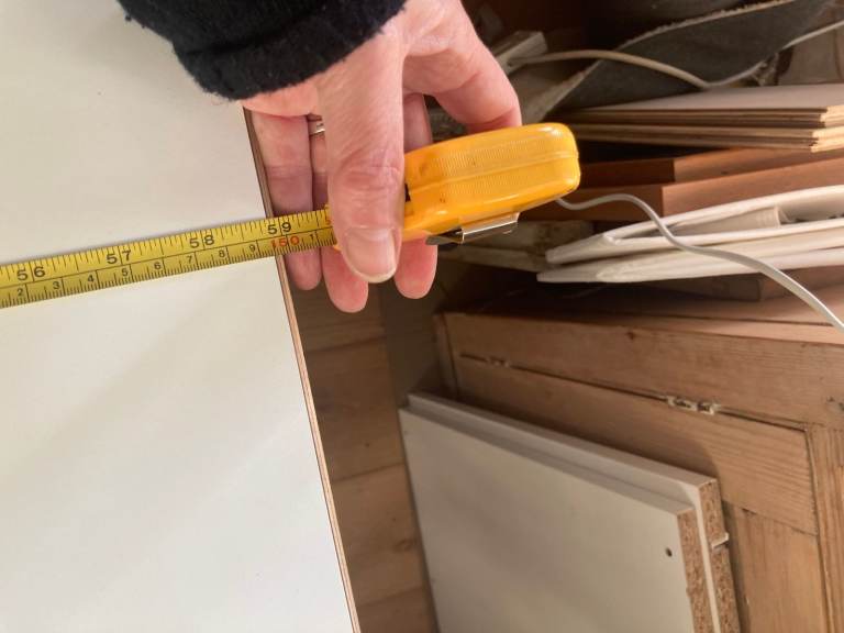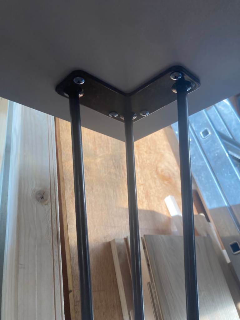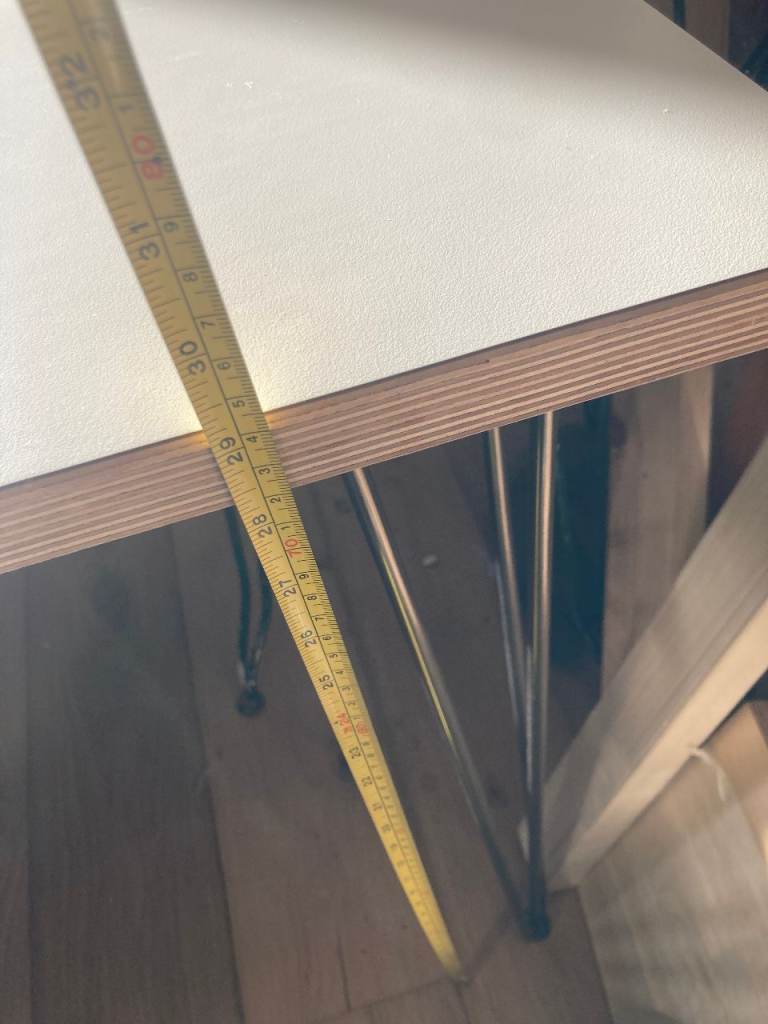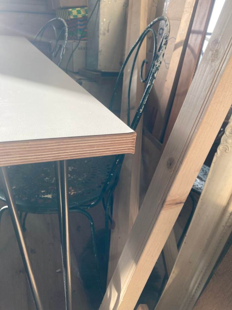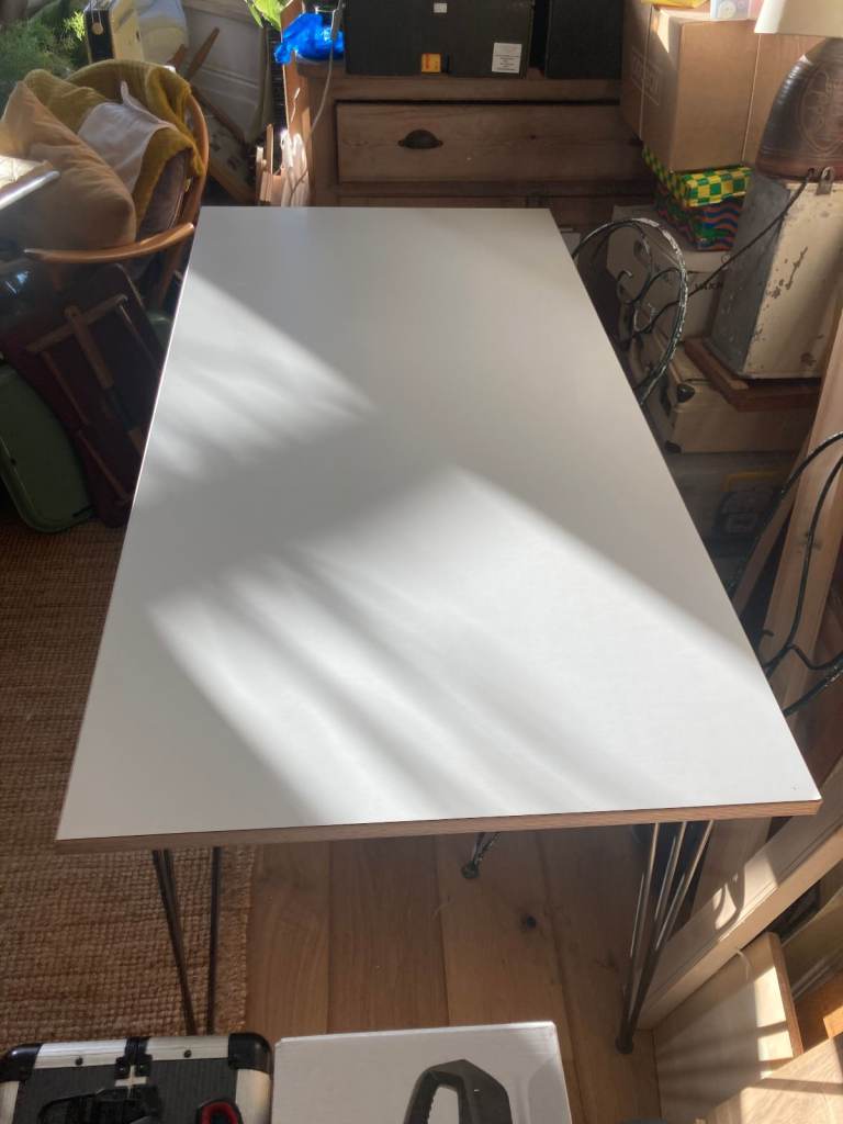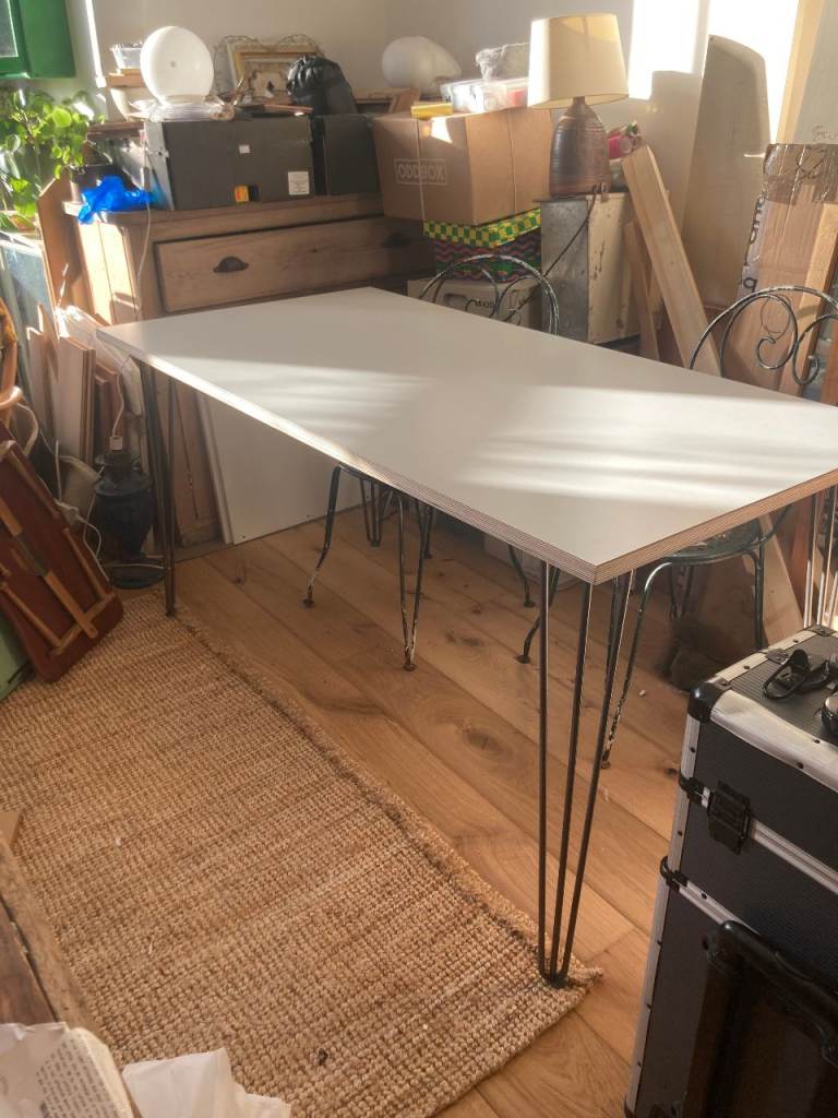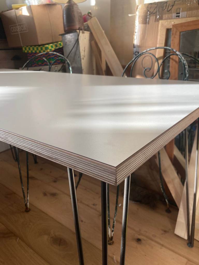 Dining / kitchen table or desk, plywood, white-topped, hairpin legs, seats up to 8