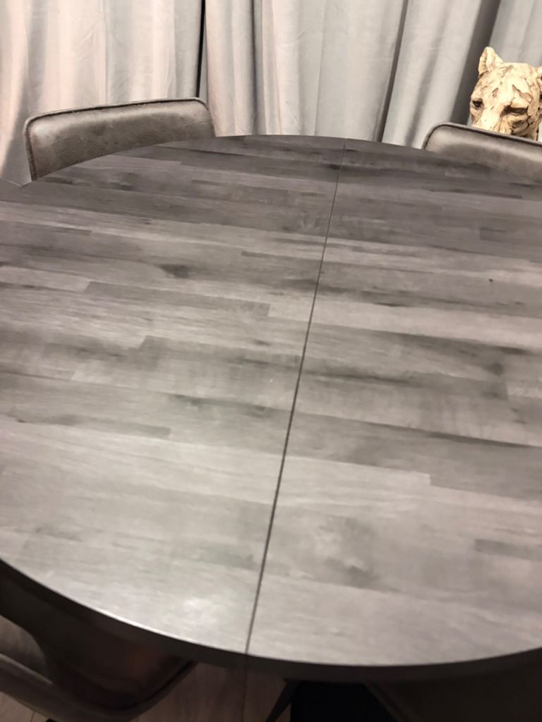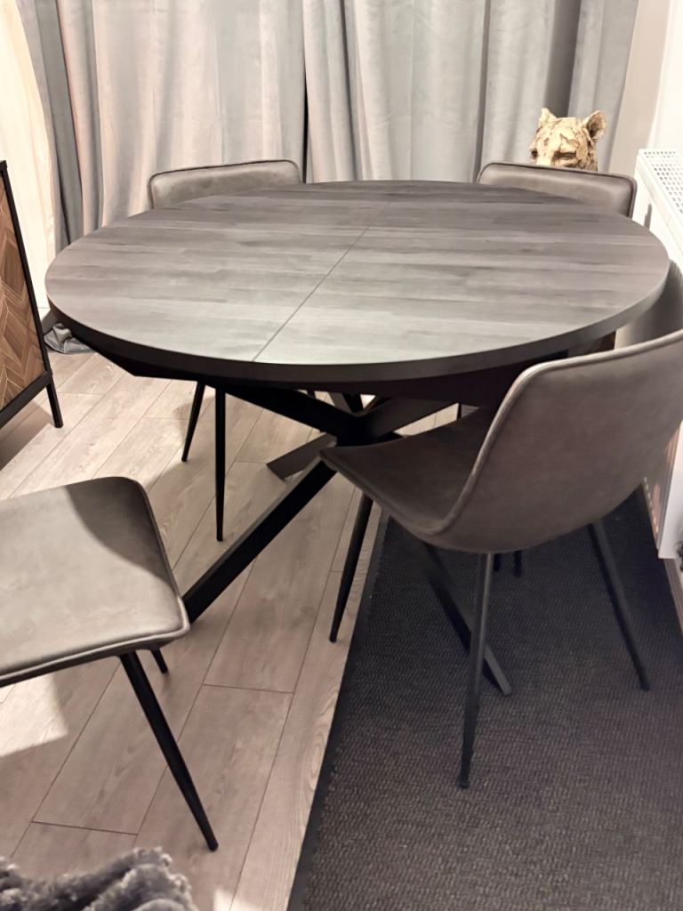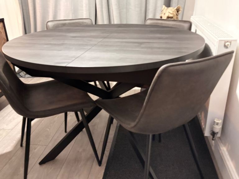 Black round 4 seater table that extends to a 6 seater