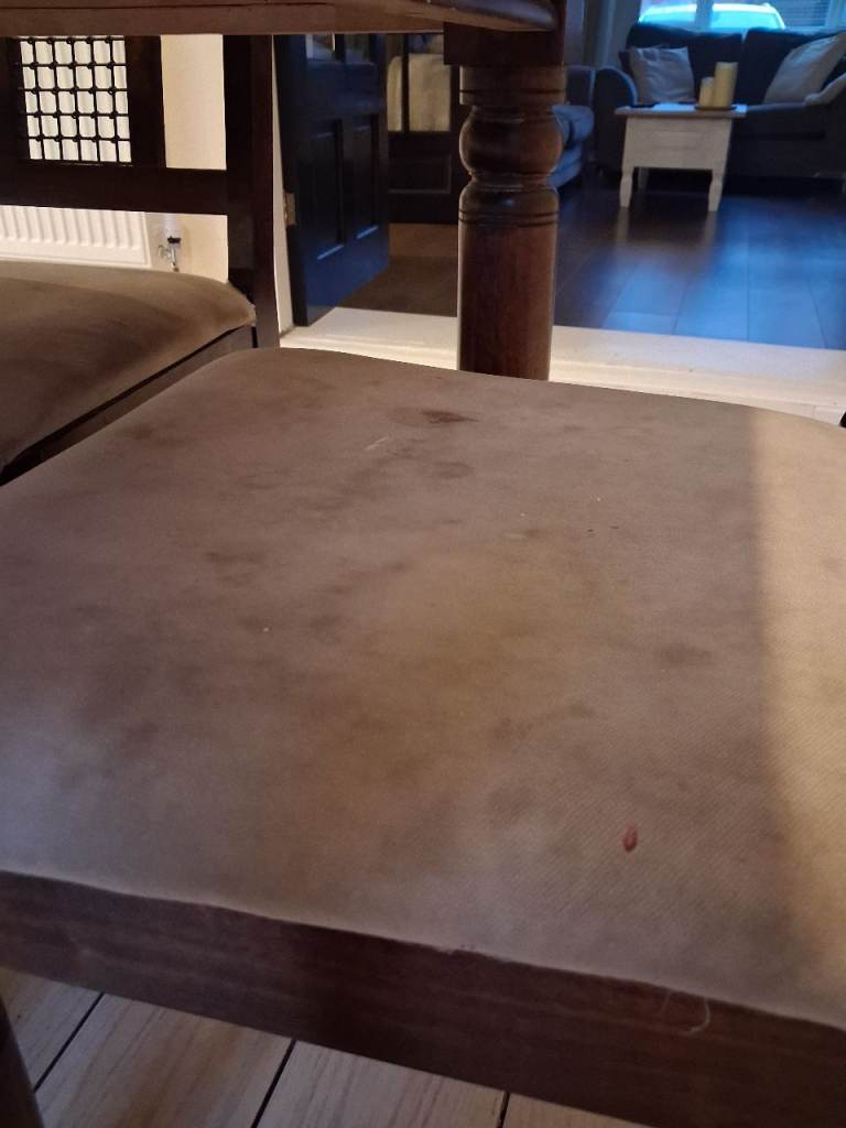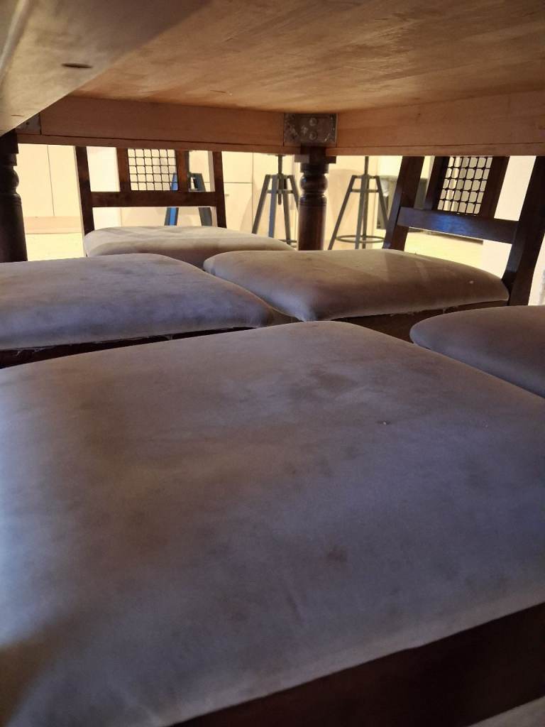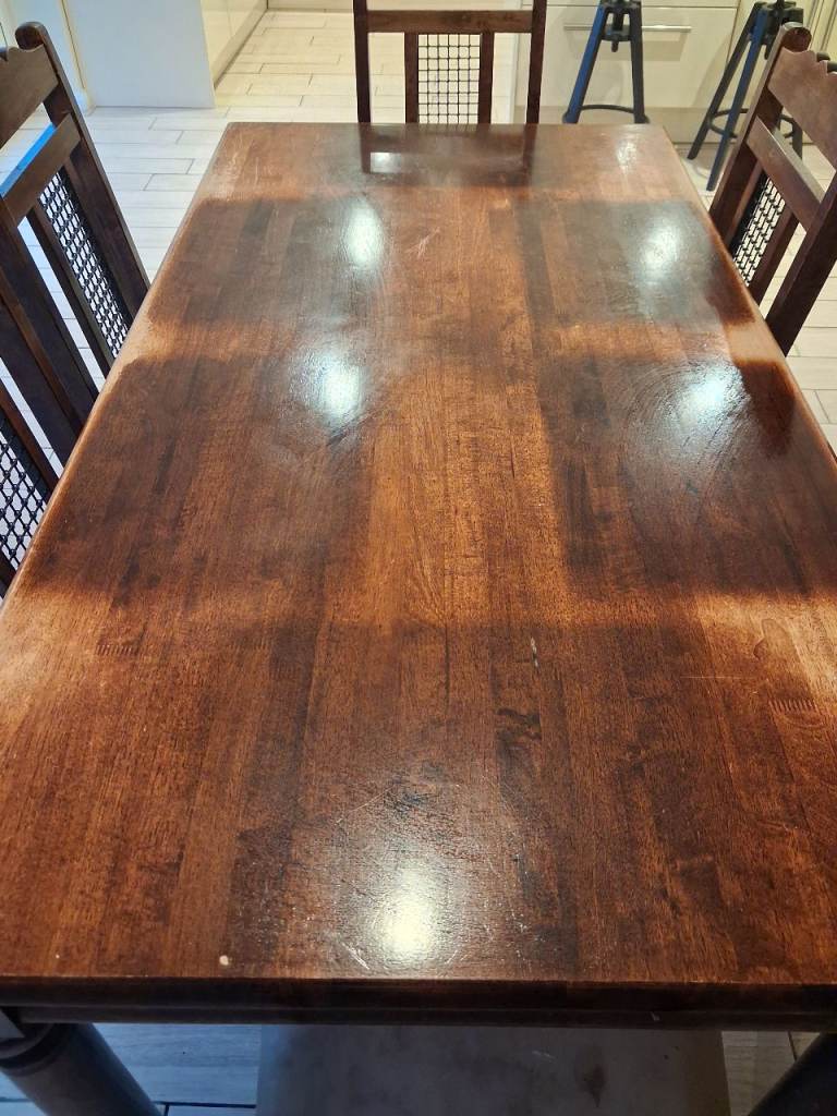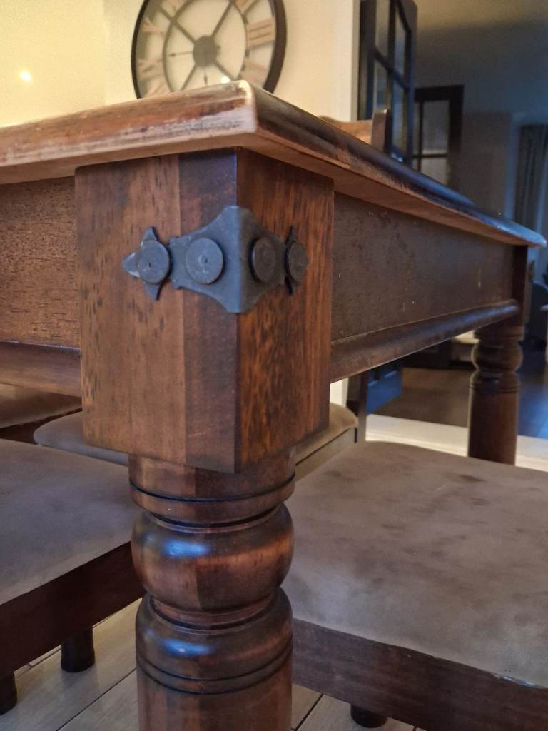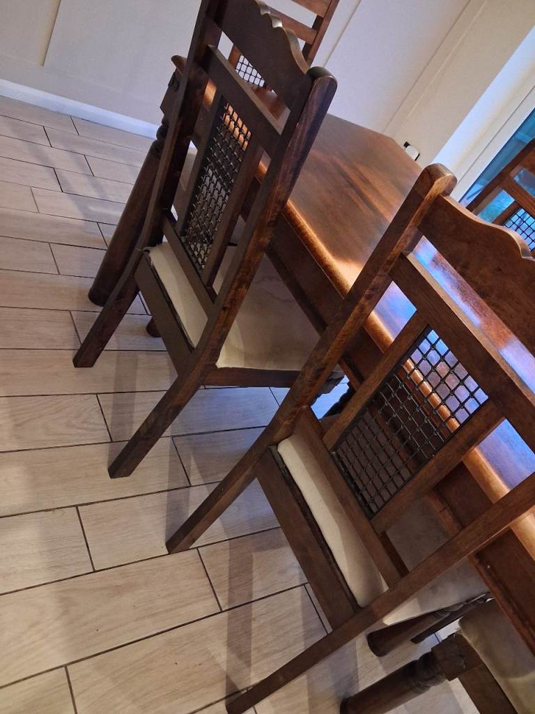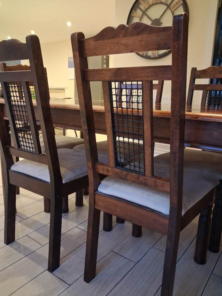 Dining table and 6 chairs, in need of some love and tlc, a great upcycyling opportunity. With black metal details, all chairs cushion pads need reupholstering and table top needs sanding and painting/ varnishing.