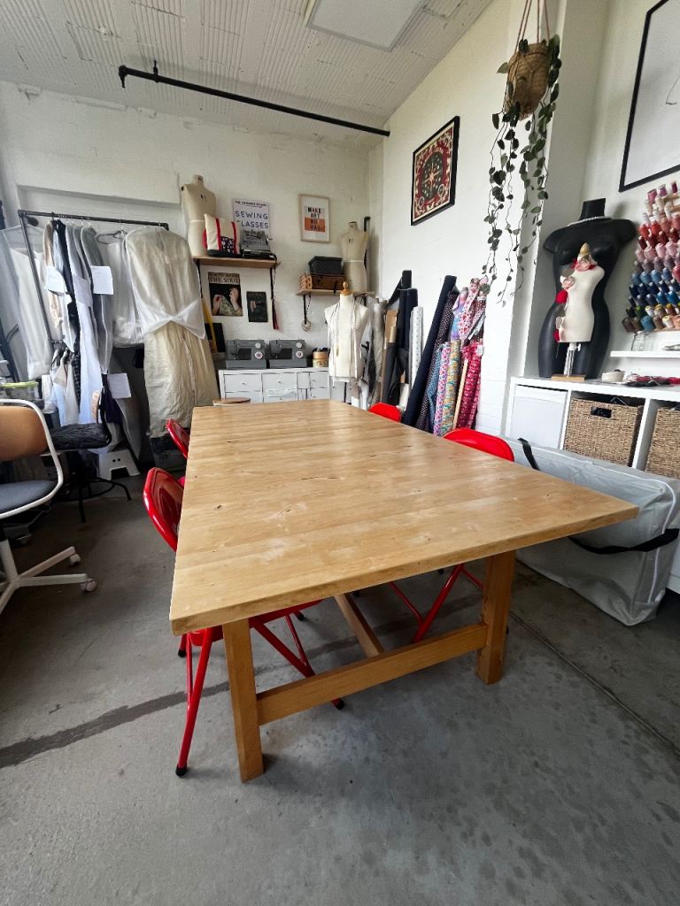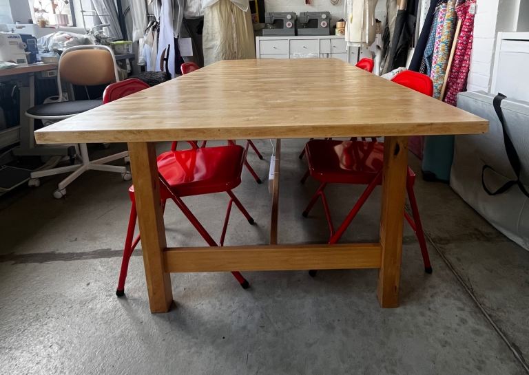 The table is made entirely of solid oak—no veneer, foil, or plastic.