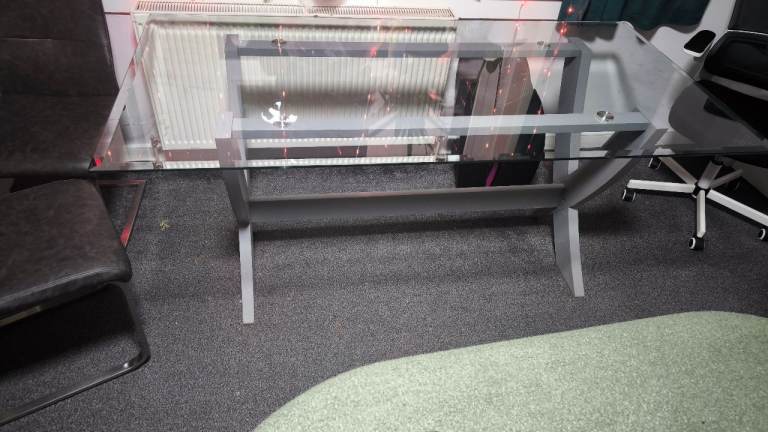 The glass top has some surface scratches from normal use, but nothing that affects functionality or overall appearance. Stable, sturdy, and well cared for.