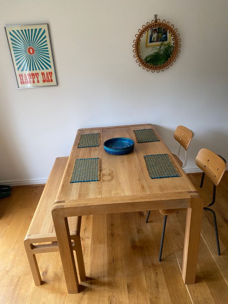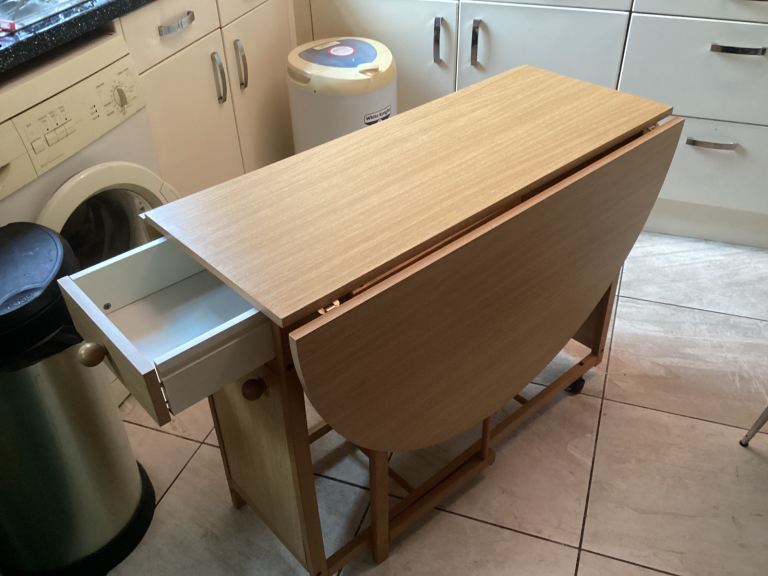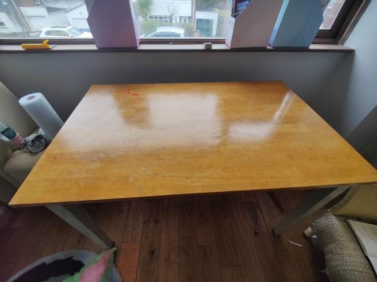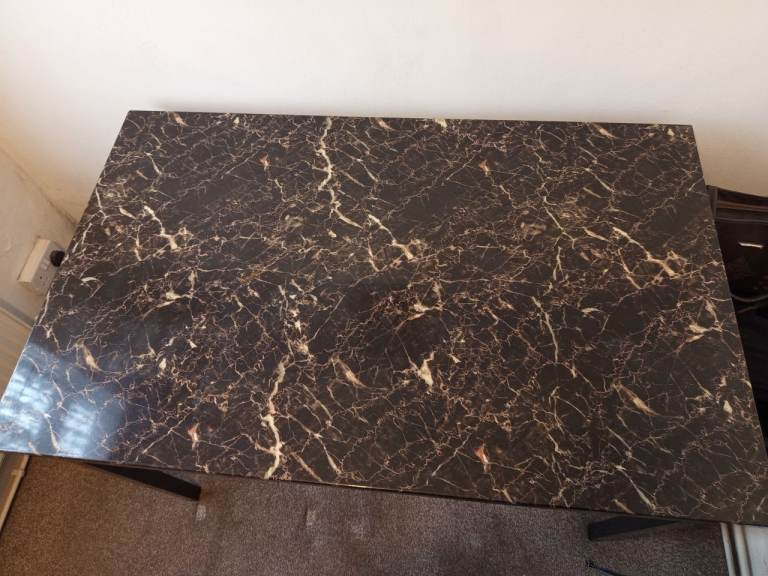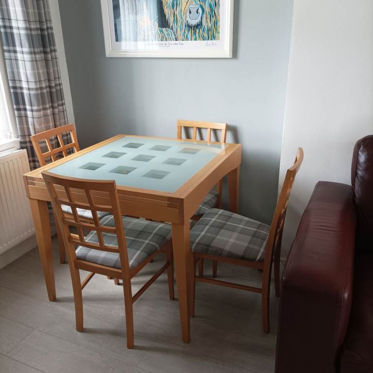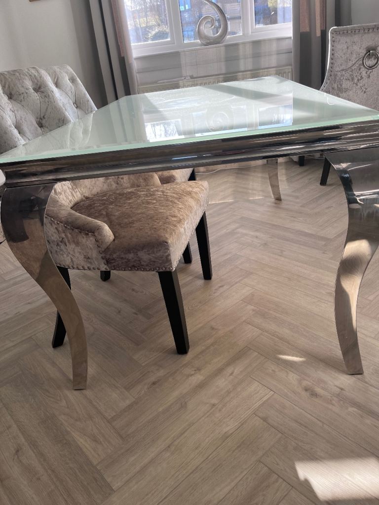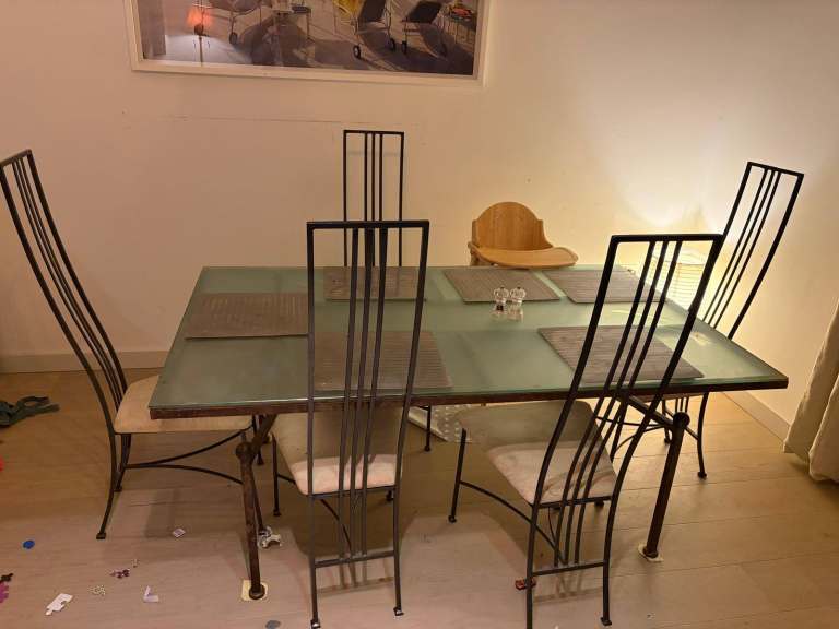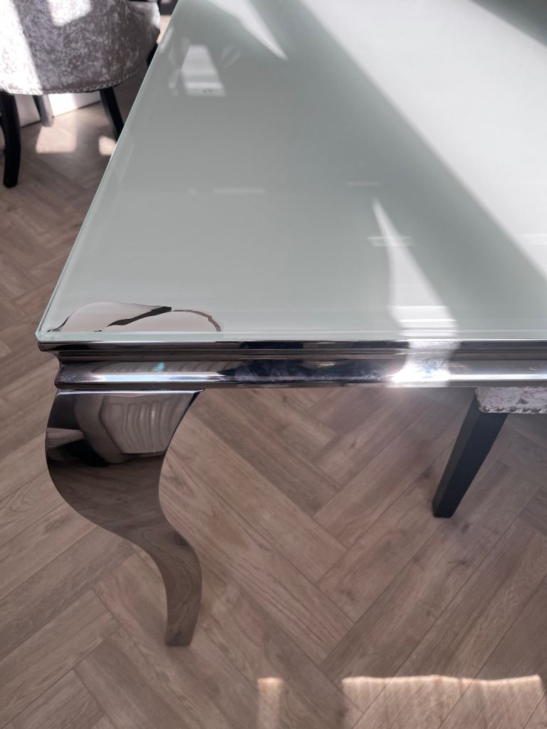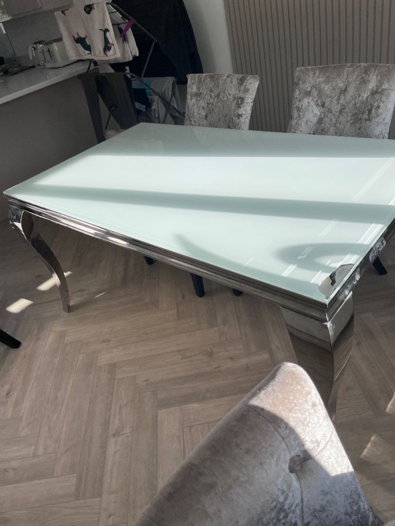 Stunning dining table ( only) seats 4/6 chairs white heavy glass top with silver mental legs. Has damage to one side as reflected in price