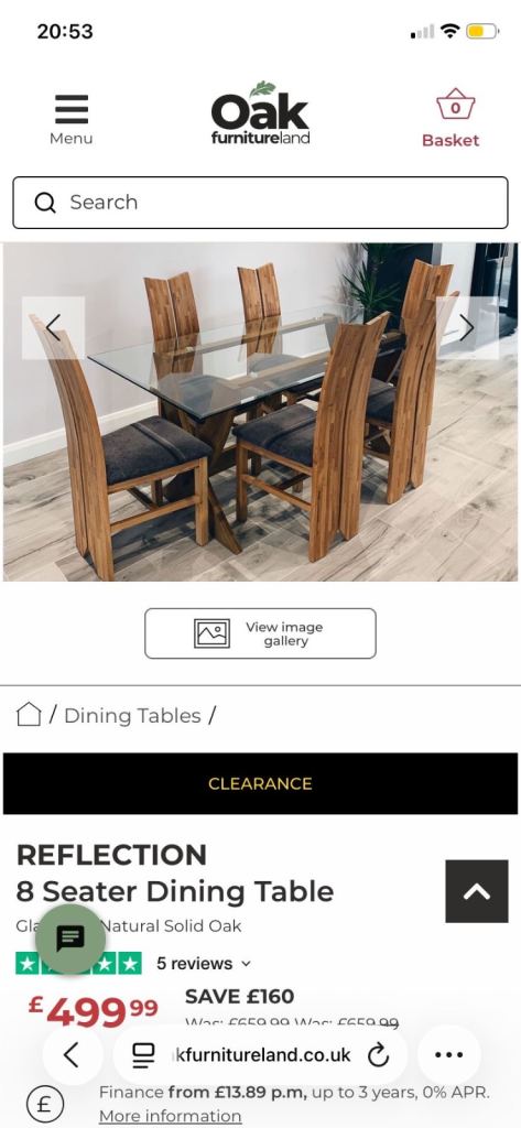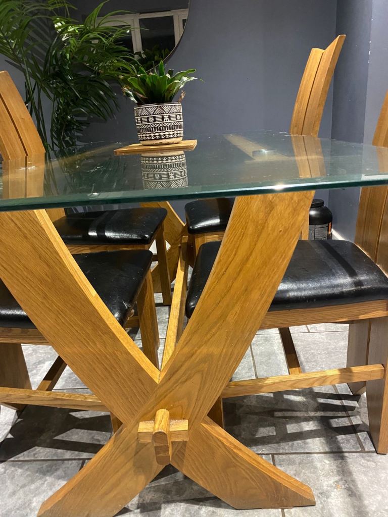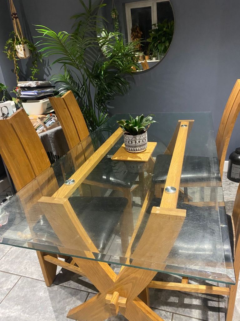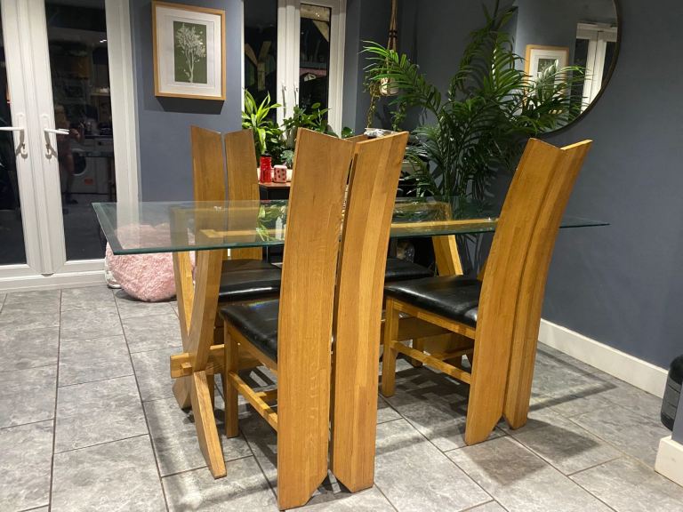 Tempered glass and Oak frame dining table. Very good condition, with just a few scratches on the glass. 180cm x 90cm. Currently on sale at Oak Furniture Land for £499. *Please note that the chairs are not included in the sale.