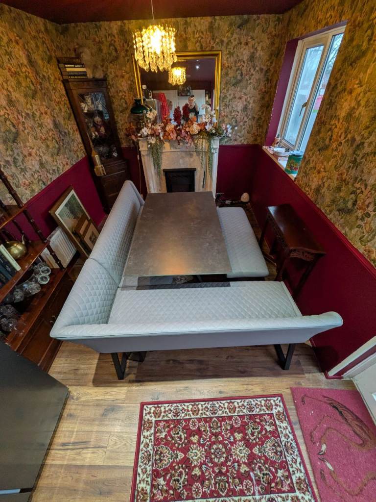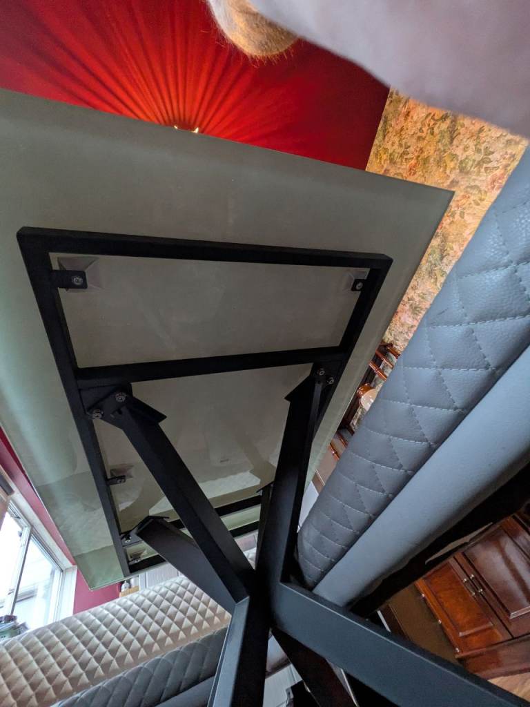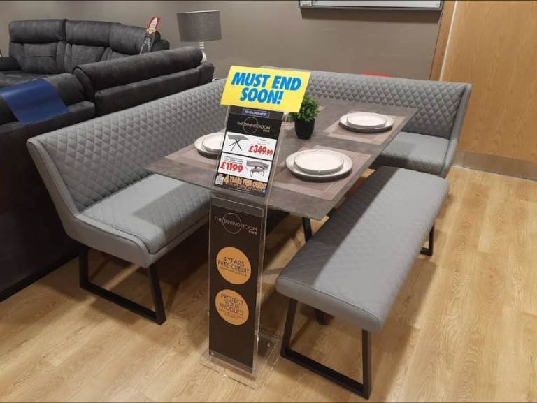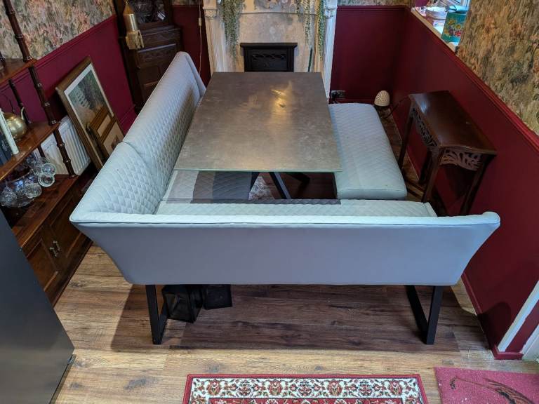 Posting for 12+ yearsDinning table and chairs Endurance Kristo Dining Set - Glass Table and Grey Leather Benches