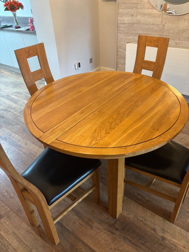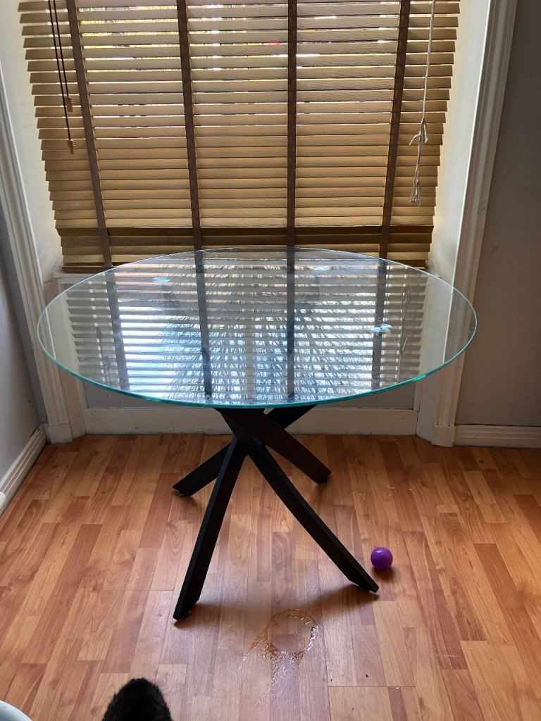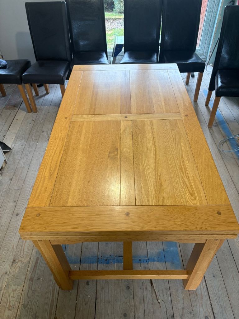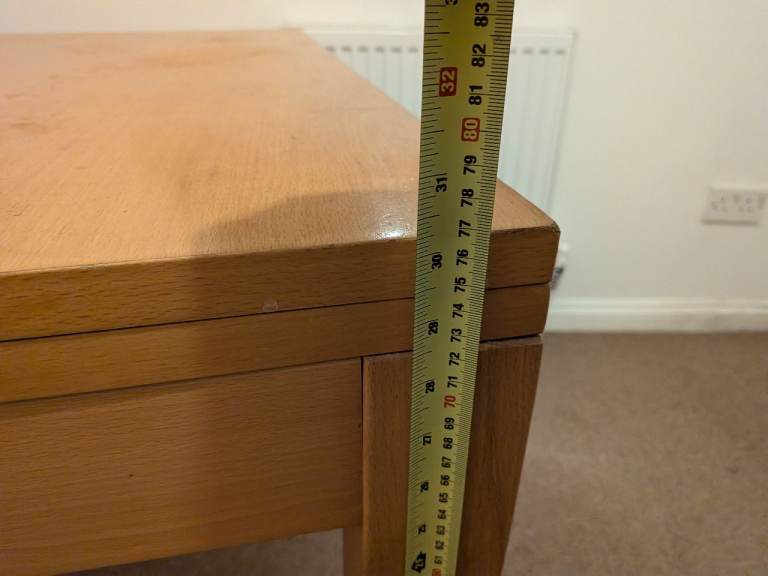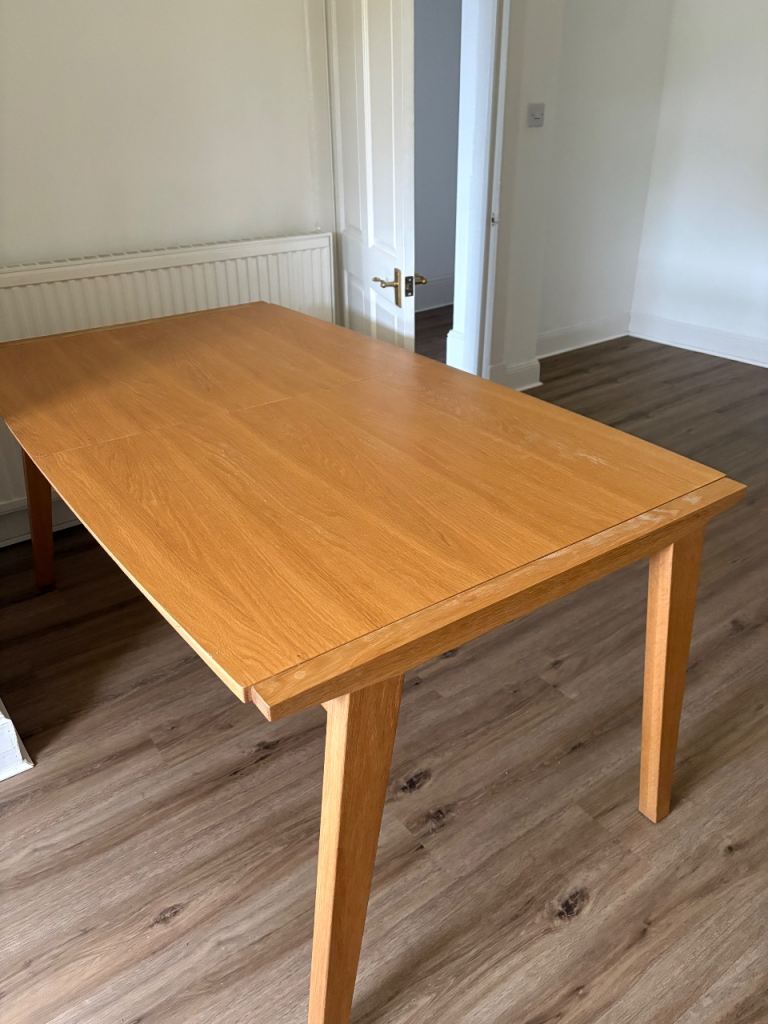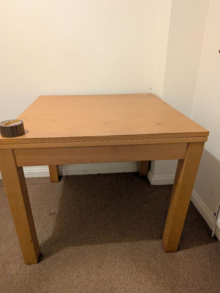 Square table 90x90cm. Expands to a 6 person table by flipping the top down as it slides. we've used it as a desk so some wear on one side and a chunk out of it, but the unfolded inside is perfect condition. Sturdy but can be dismantled into a hatchback as legs come off.