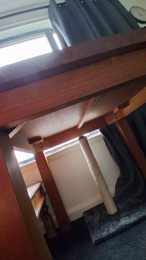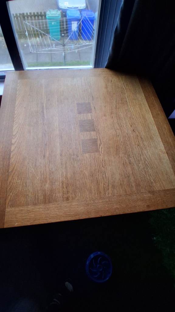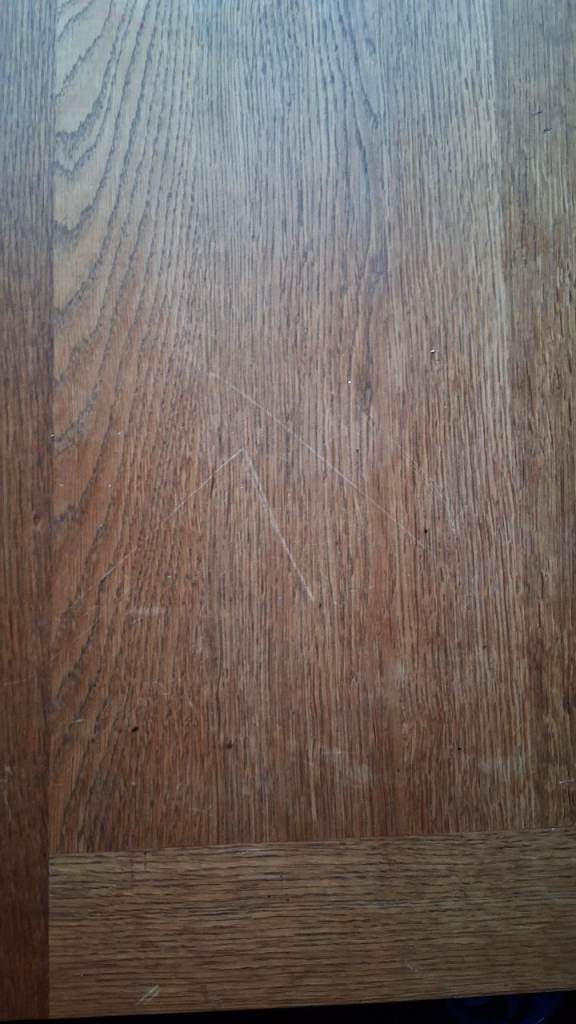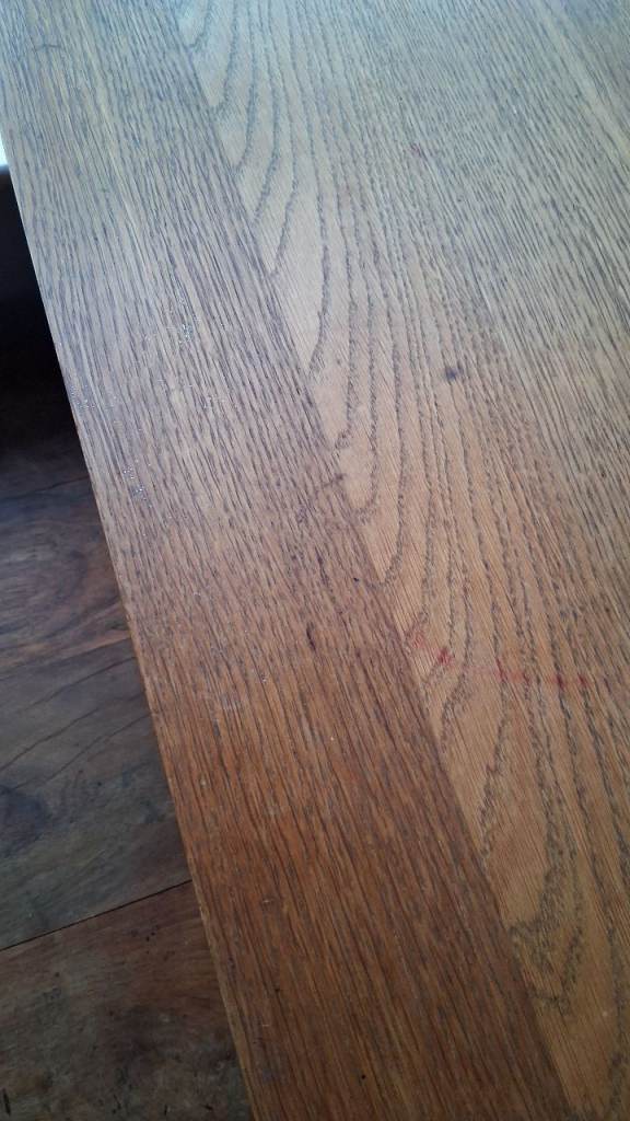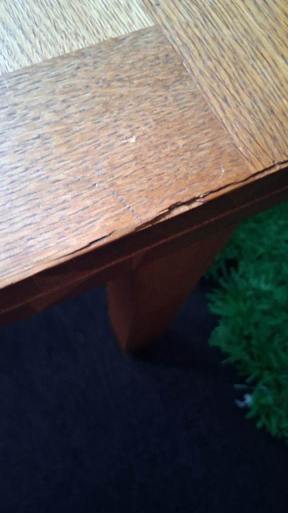 Used for a long time but as its real wood its very sturdy and will last many more years. Easily covered with a table cloth.