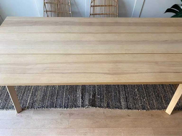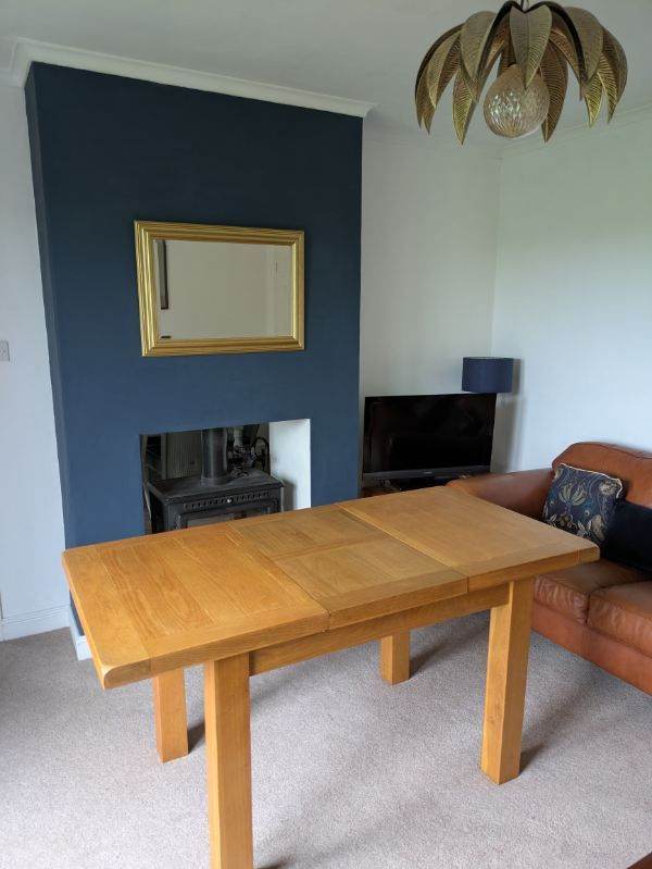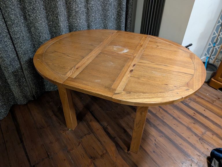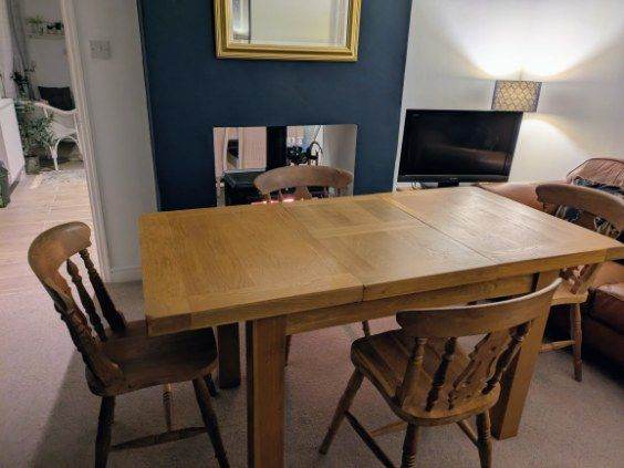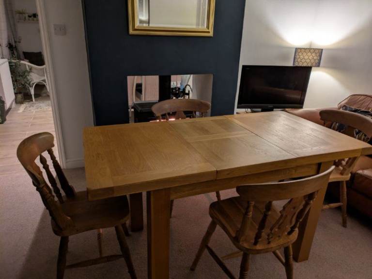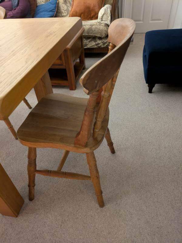 Light oak table, with four fiddle back chairs-can separate if required. The table dismantles for easier movement. In very good condition and the table was fairly recently bought at Simple Dutch. Good to seat extra people at Christmas.