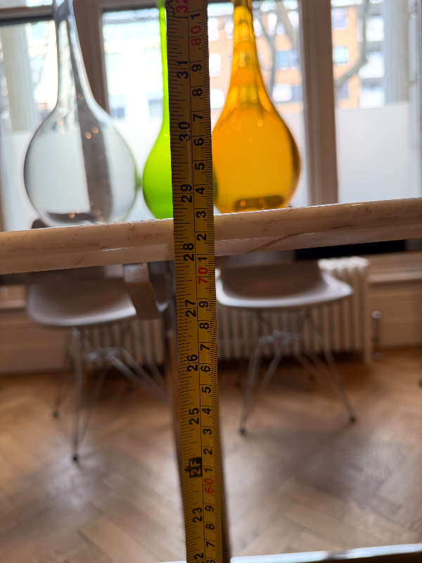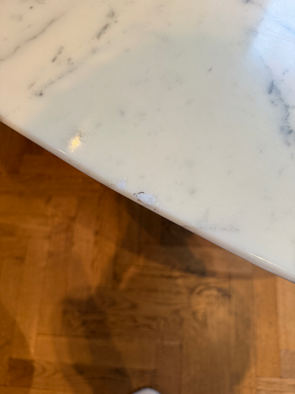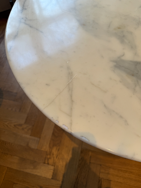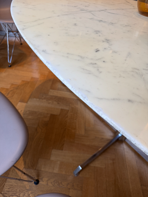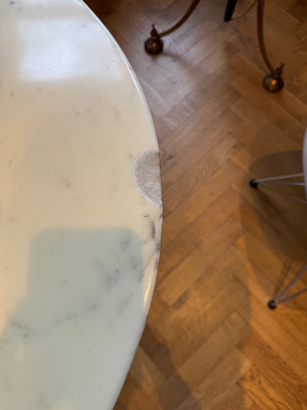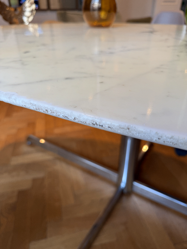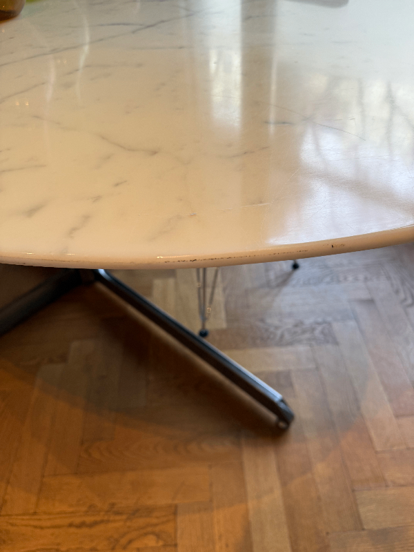 Used condition – some small chips and light wear to the marble edges, a hairline scratch, and minor surface marks (all shown in the photos). Chrome base in good condition. The table has a wobble which may be due to the base fixings needing tightening. Still looks fantastic in situ.