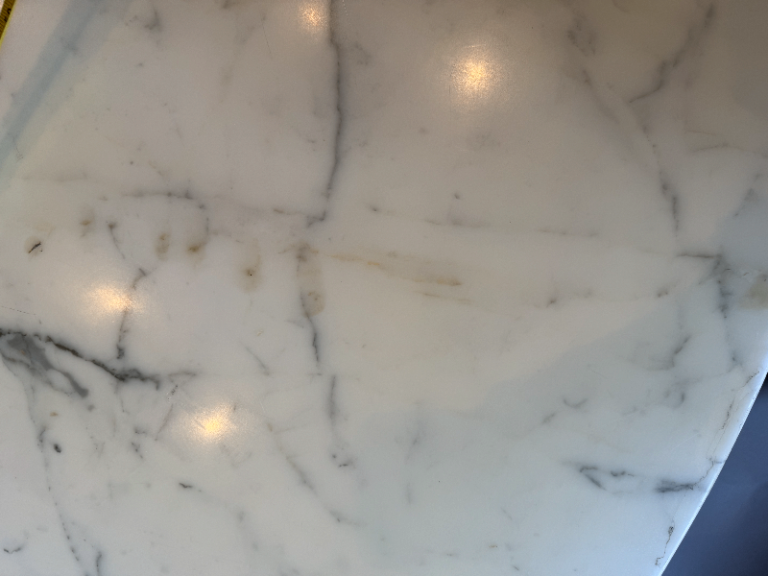 The marble has developed a warm patina over time, with some areas taking on a slightly warmer/creamier tone, as is typical of white Carrara marble with age.