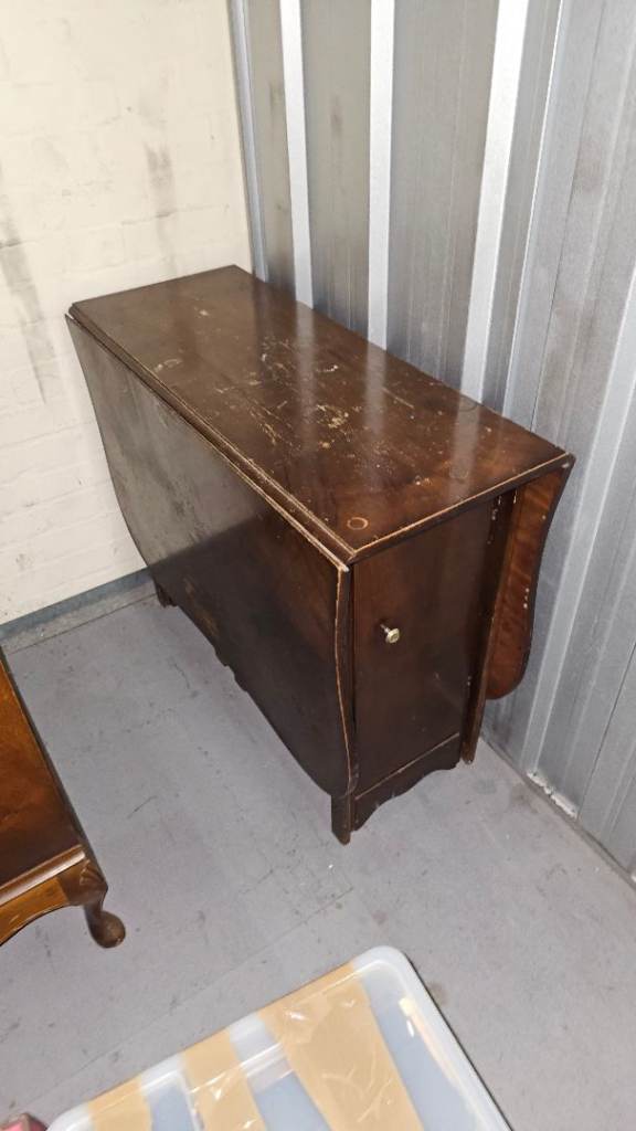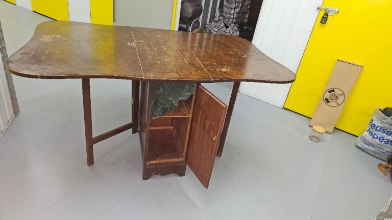 This is old and the surface is pretty scratched up and superficially damaged, but it's a solid and functional bit of furnature. If sanded and treated it would be a very good looking table. I keep it in my storage unit in Bow so it would nees to be collected from there on a Fri, Sat or Sunday. I also have a writting bureaux that matches for sale.