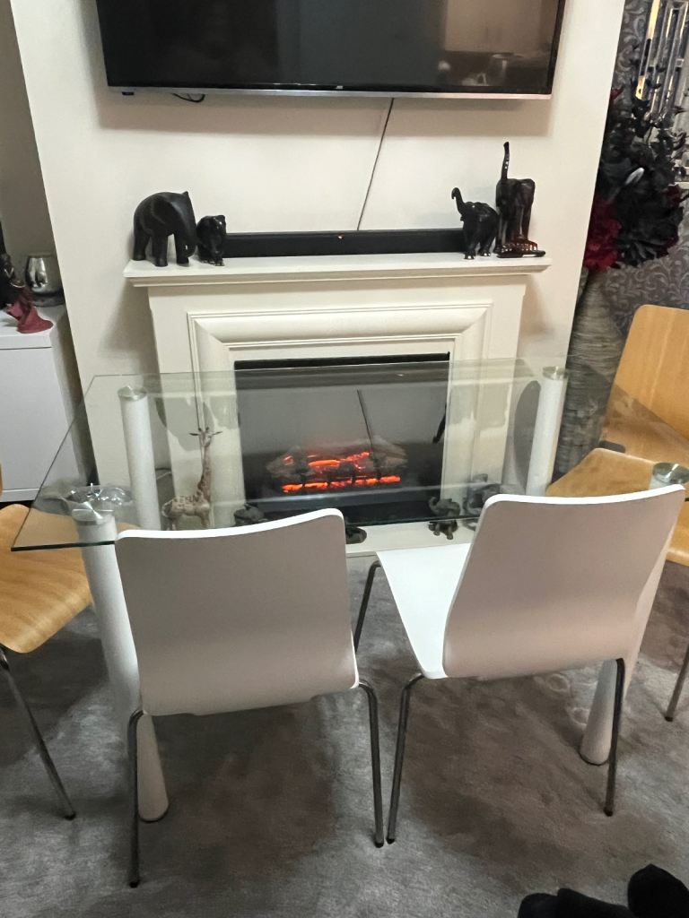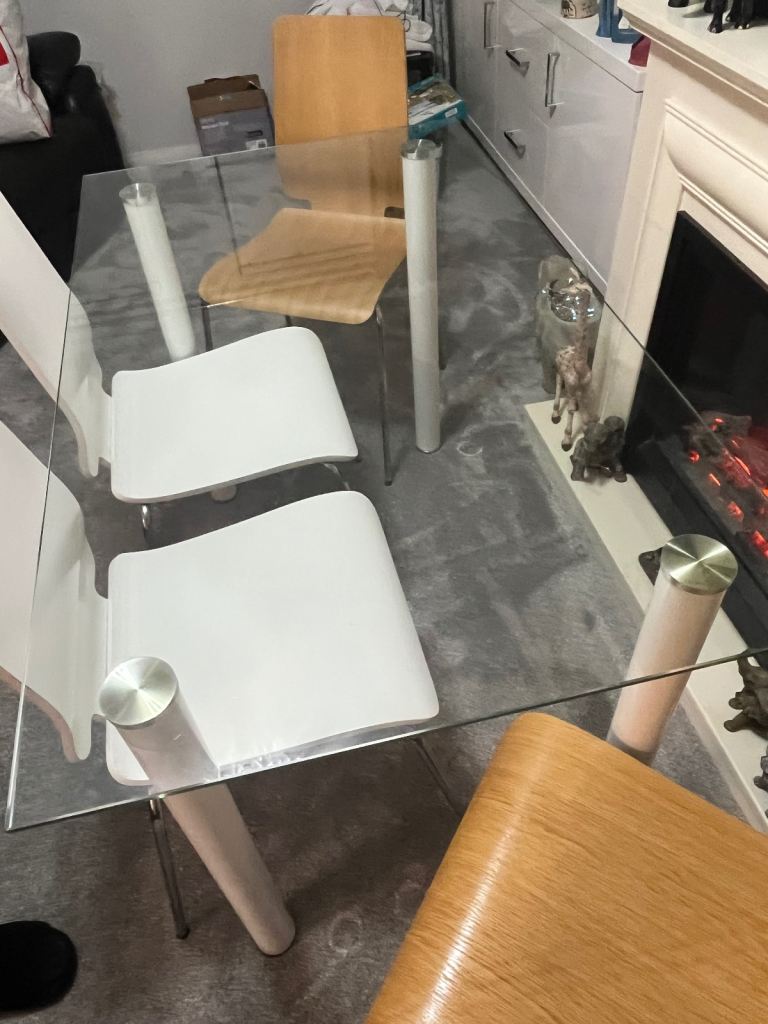 Posting for 13+ yearsGlass dining table and 4 sturdy chairs