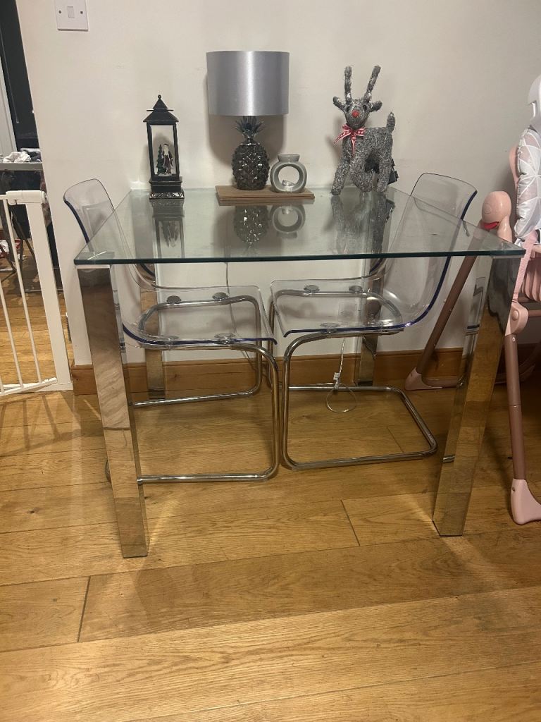 Glass table with two IKEA chairs included. Well used but still in good condition with a couple of scratches on the glass. I can screw legs off for being collected. Collection only please.