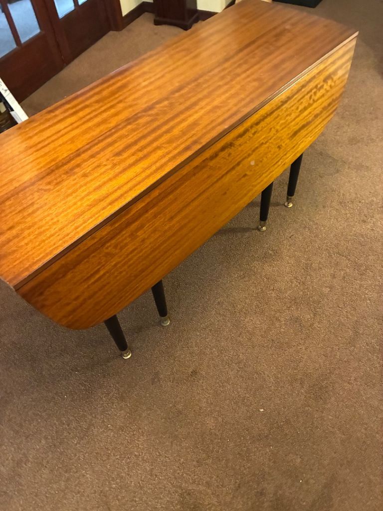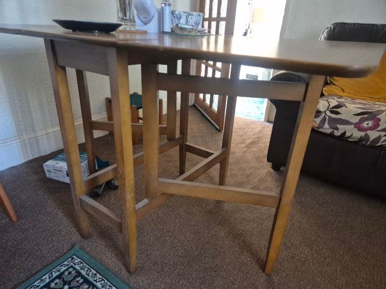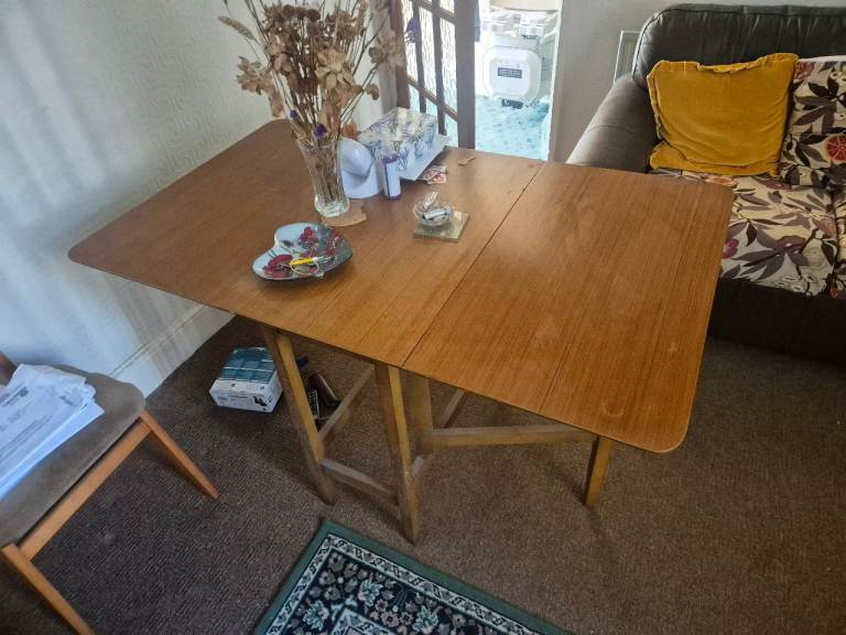 It's a practical drop leaf design, great for smaller spaces.