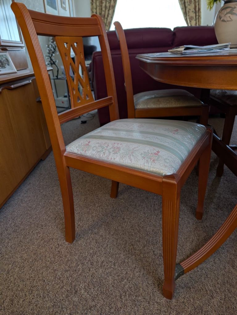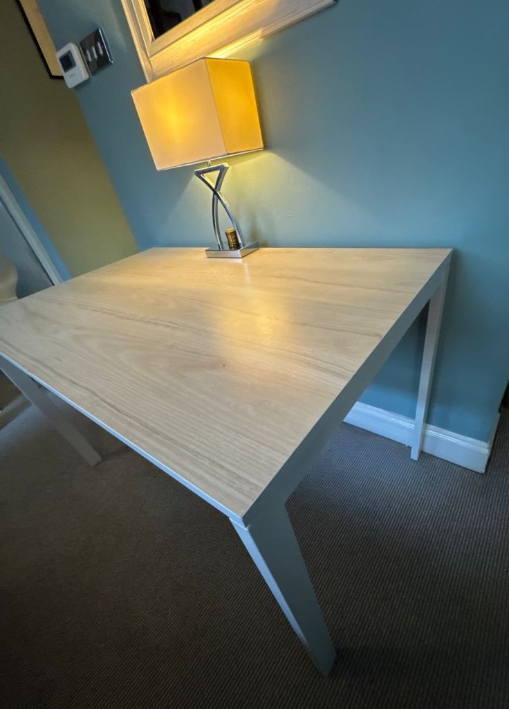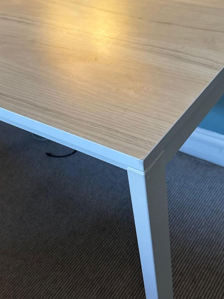 This stylish beech dining table with white metal frame and legs is about five years old. It's still in very good condition but I am downsizing to something smaller. Sturdy and modern. Plenty of life left in it yet.