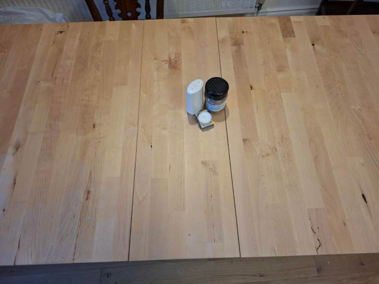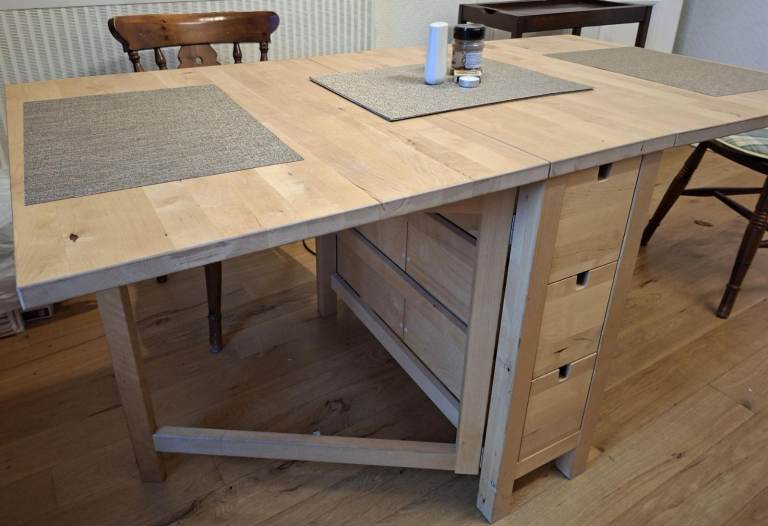 Kitchen dining table in light natural birch. It has 2 drop leaves so can be compact but can seat 4 to 6 people fully extended. There are 6 deep storage drawers to store cutlery, napkins, etc. Solid (quite heavy), doesn’t “shoogle”. In very good condition. £249 new from Ikea.