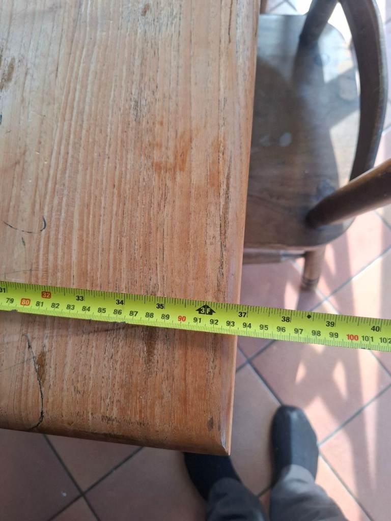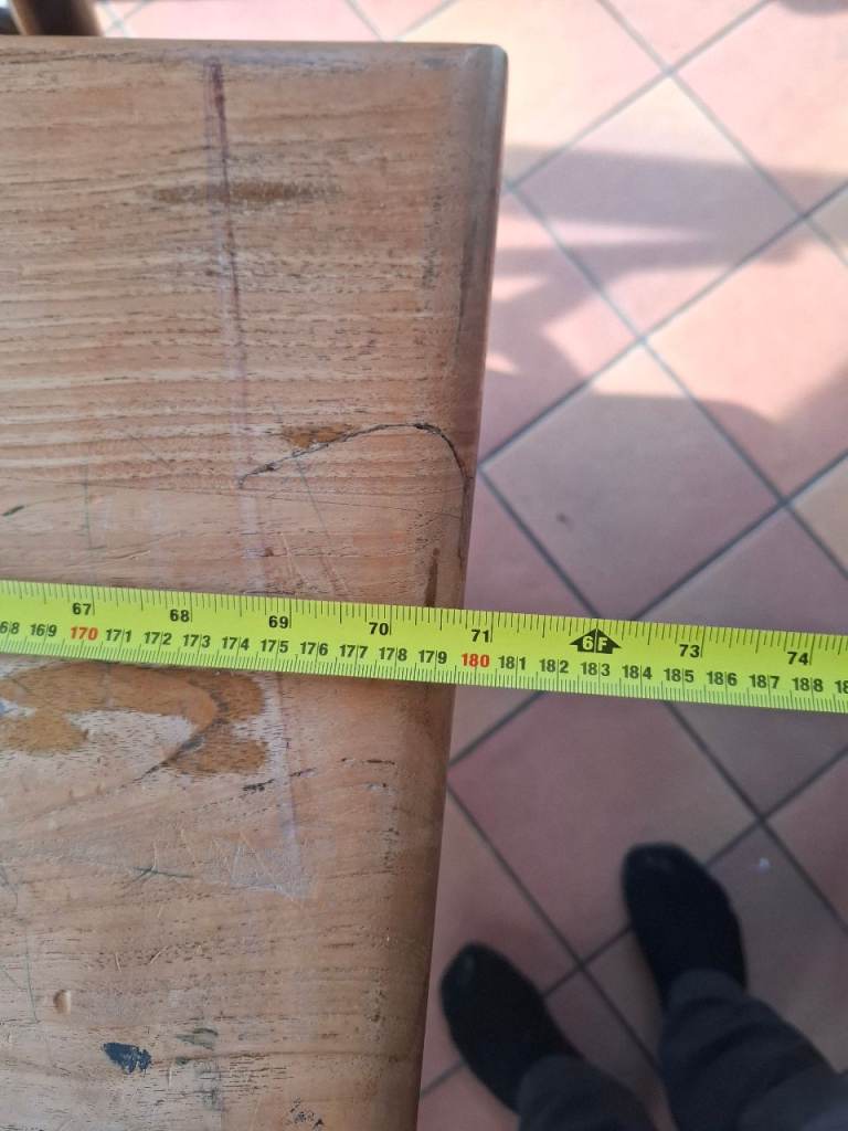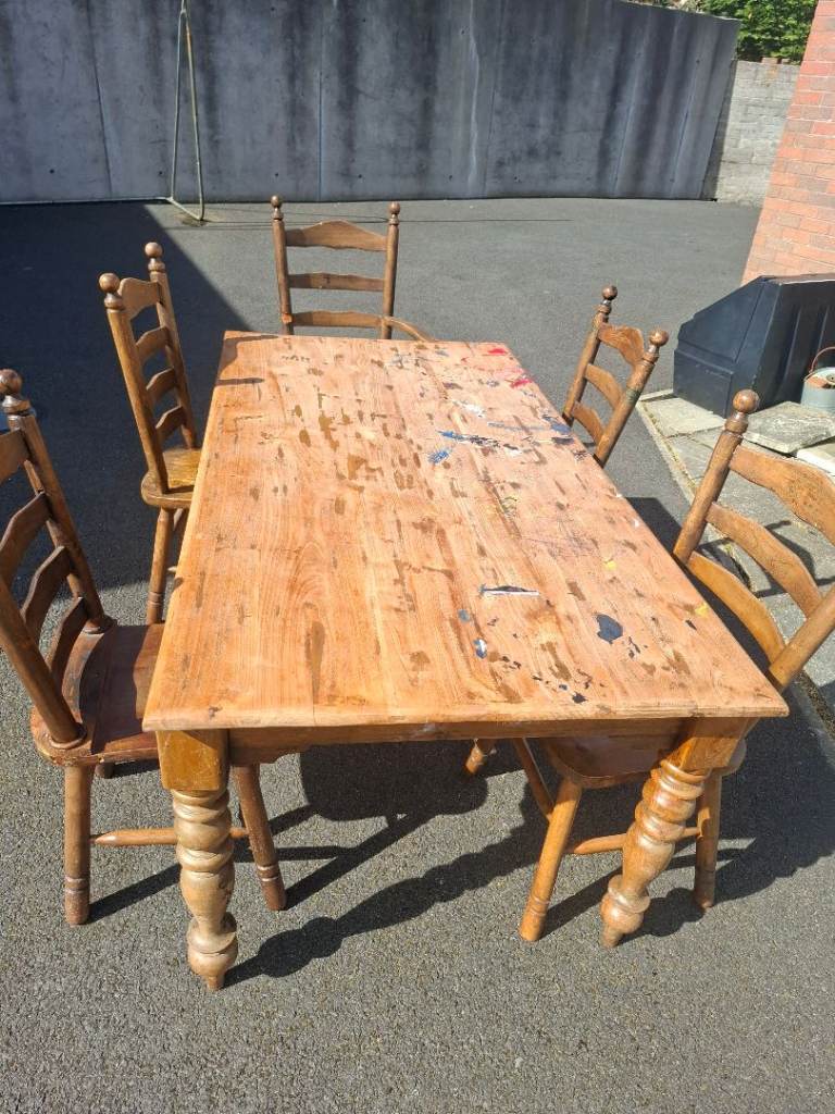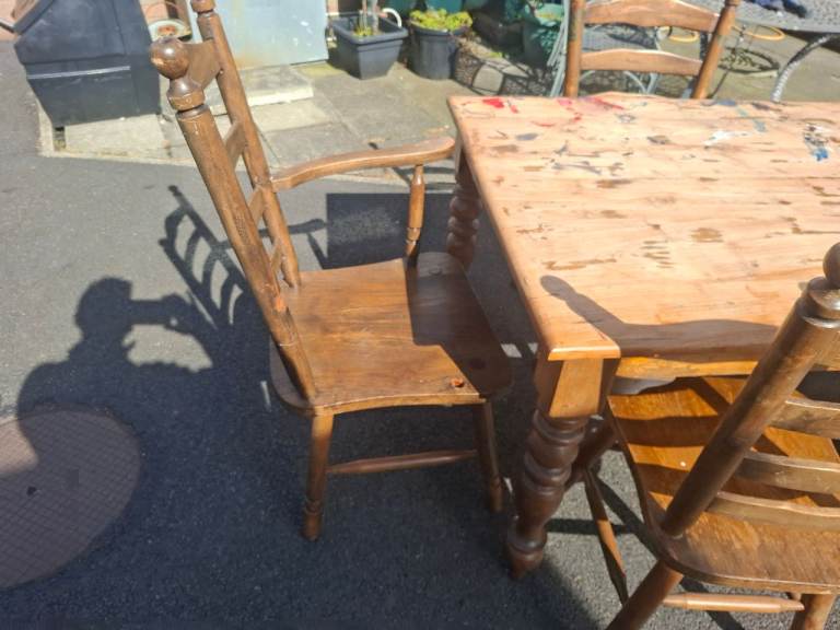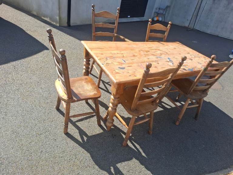 6'×3' solid table and 5 chairs. Excellent opportunity for someone to up cycle. Table does not fold, it is solid timber so will need to consider this when collecting. 5 chairs, 1 of them has arm rests but has 1 arm rest broken. Table will probably clean up ok as its children's paint spilt on it.