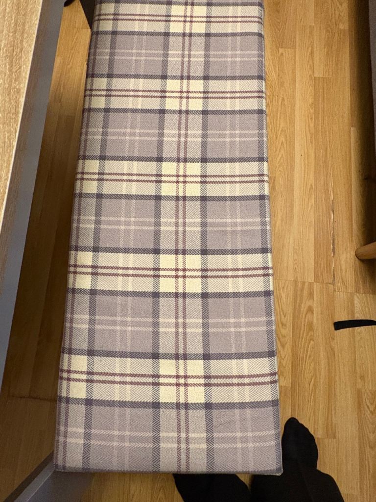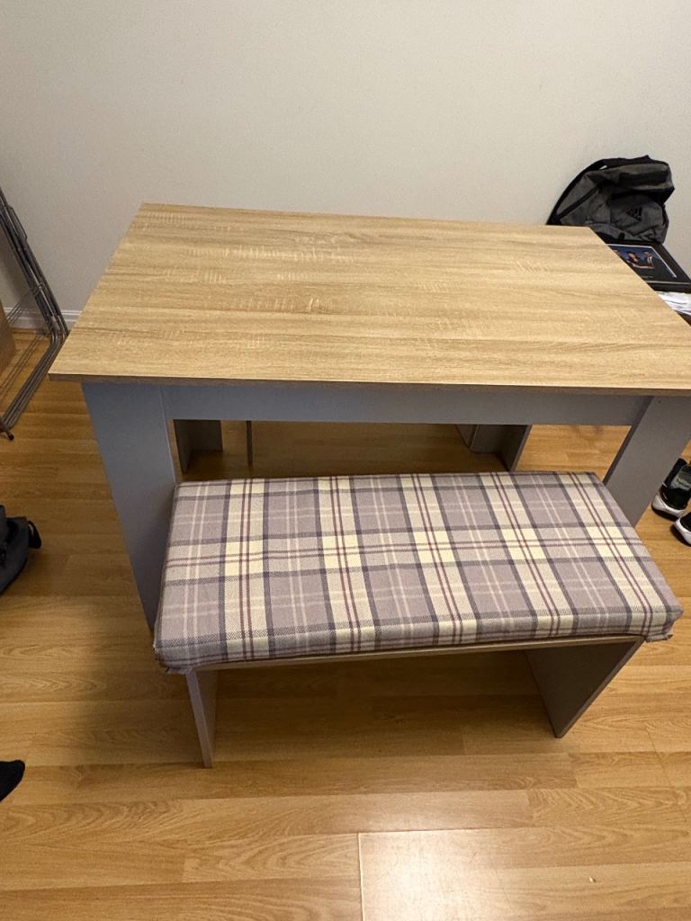 Posting for 3+ monthsKitchen table with bench. Hand made cushions made to fit.