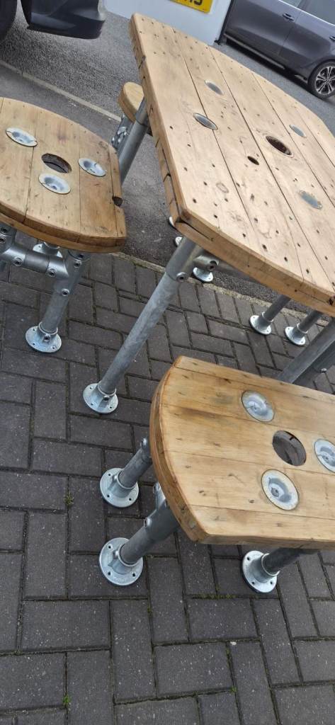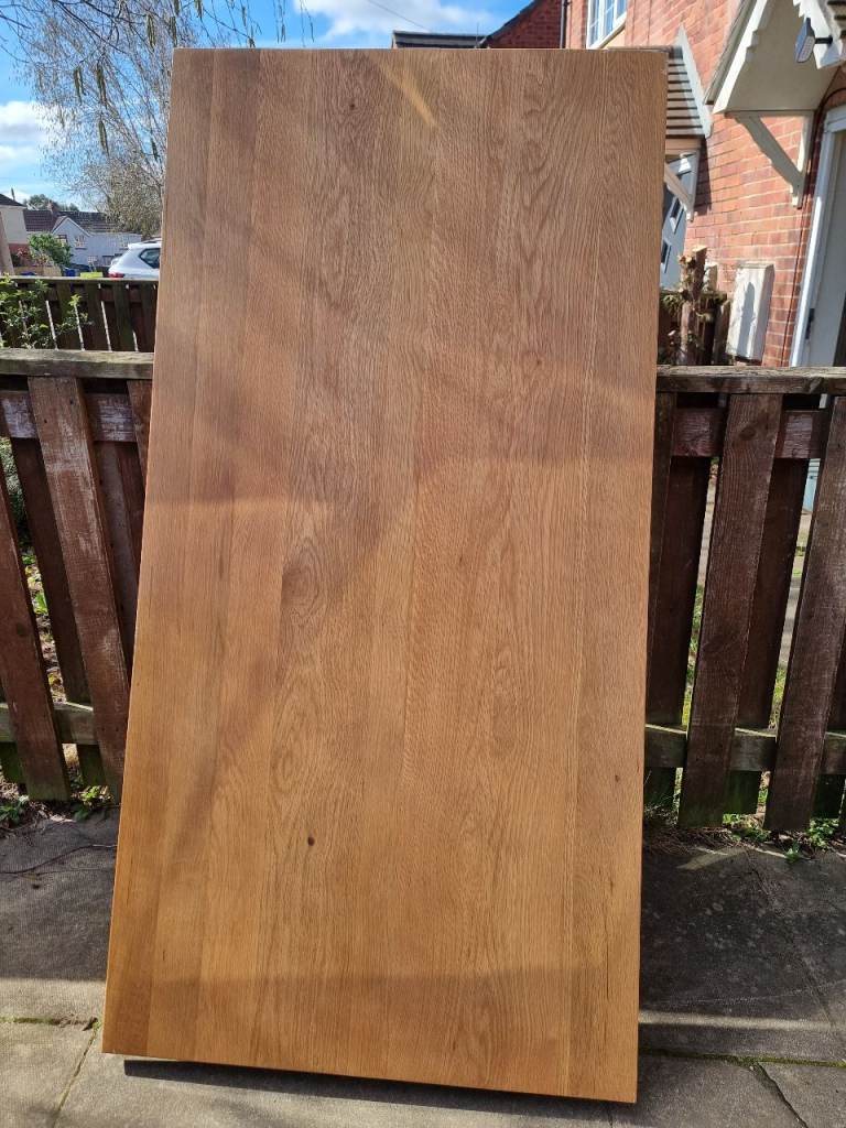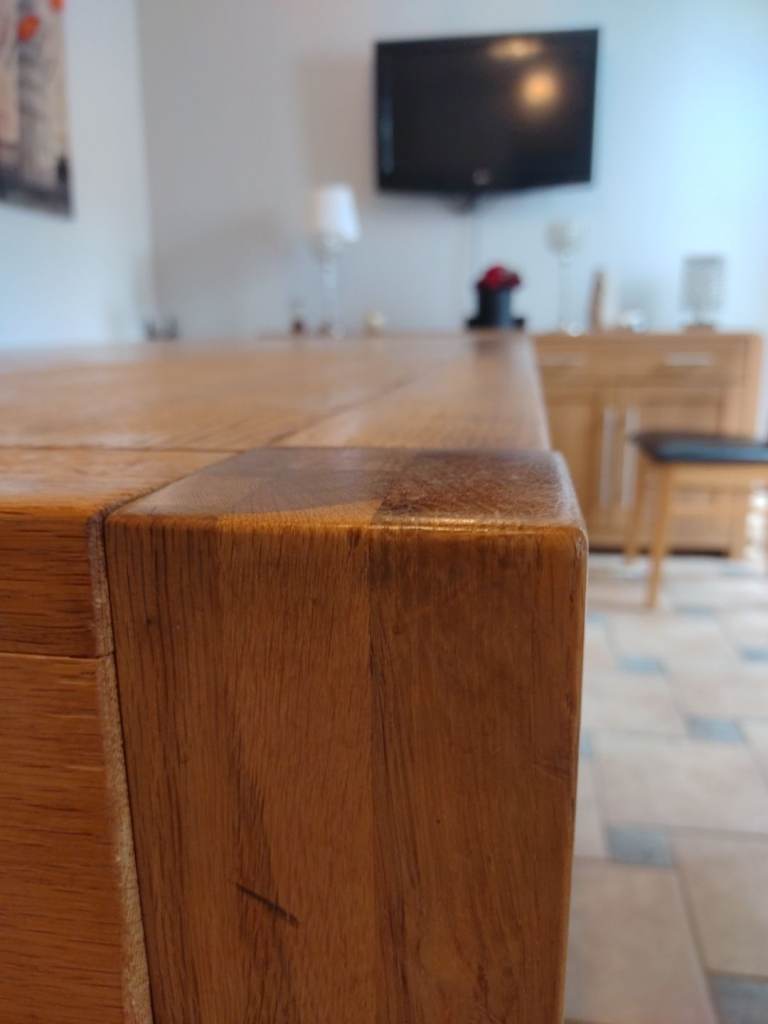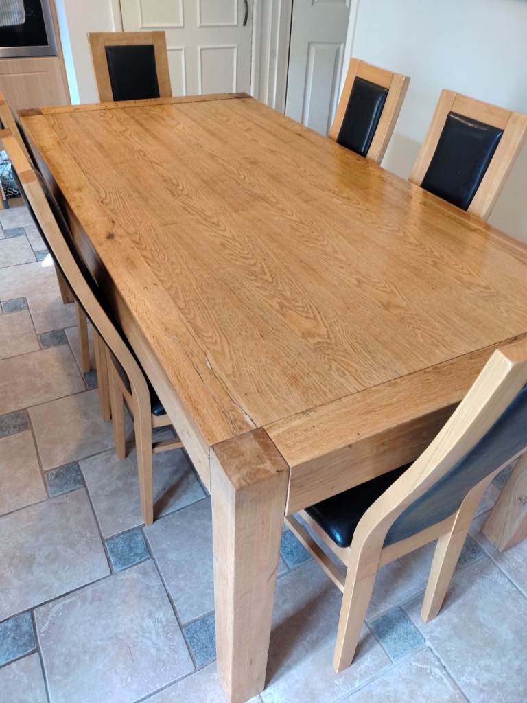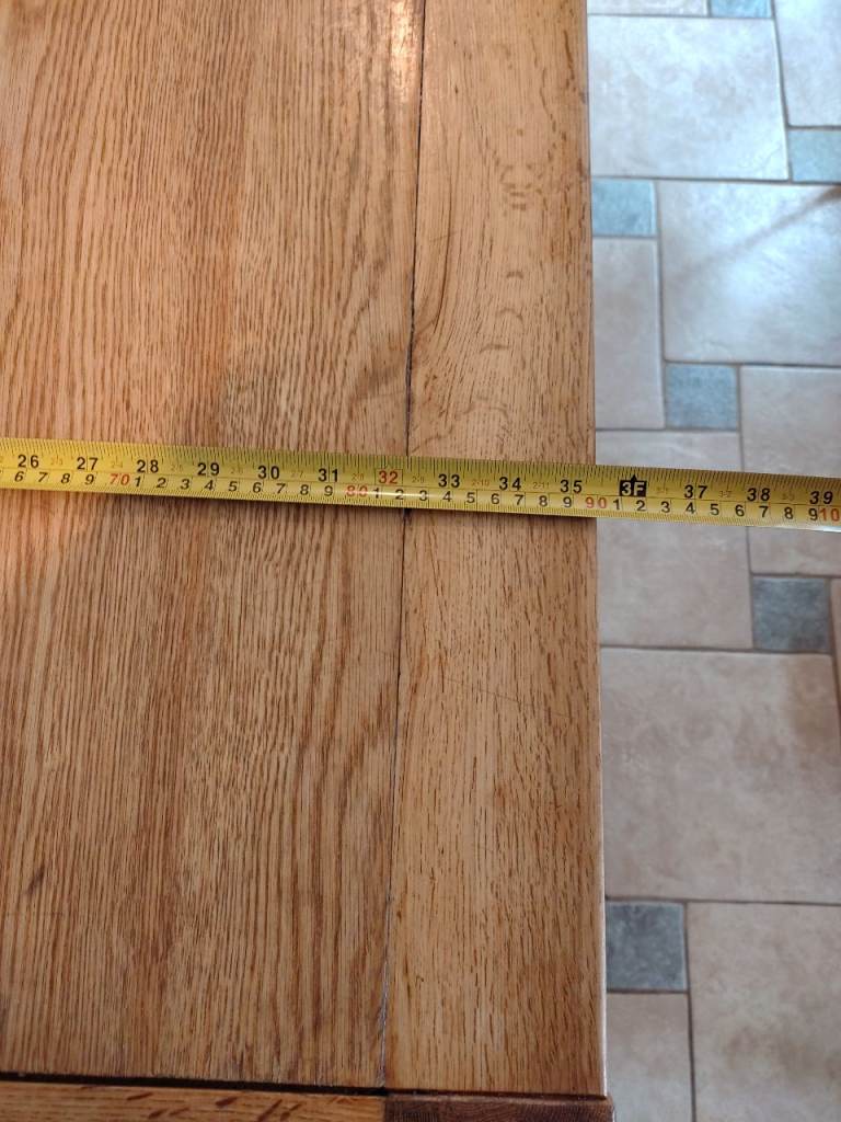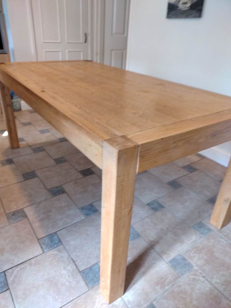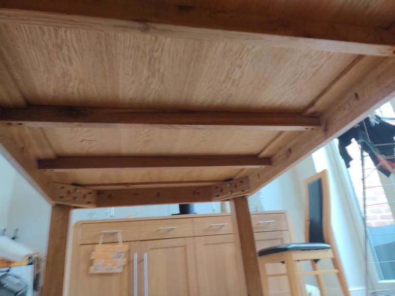 Good solid table as pictured. We are selling because no longer need such a big table . It is in used condition so a few marks and varnish wear here and there but it has served us well and needs a new home .