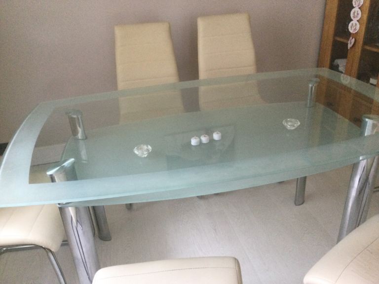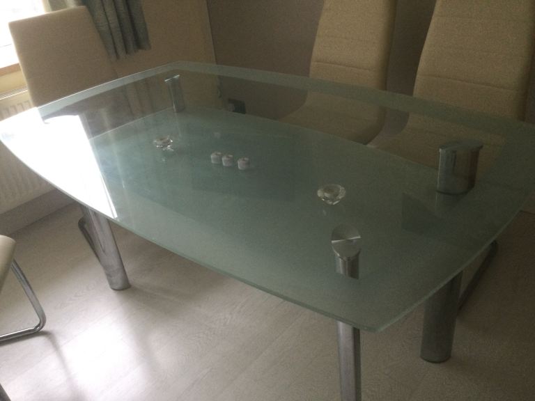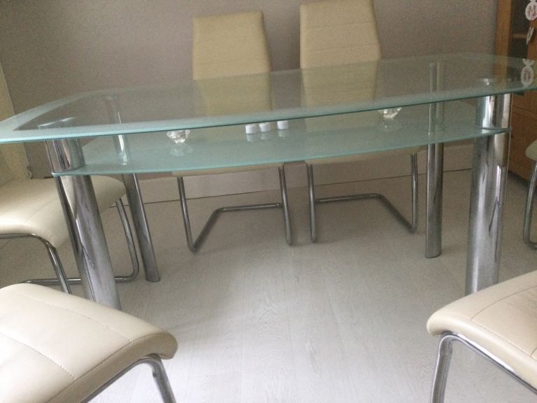 At least a six seater double layer glass dining table with chrome legs and upstands in lovely condition. Originally bought from Dunelm. The lower level can be used for decoration or as extra serving space. Dimensions in centimetres: L160 x W 95 x H 76
