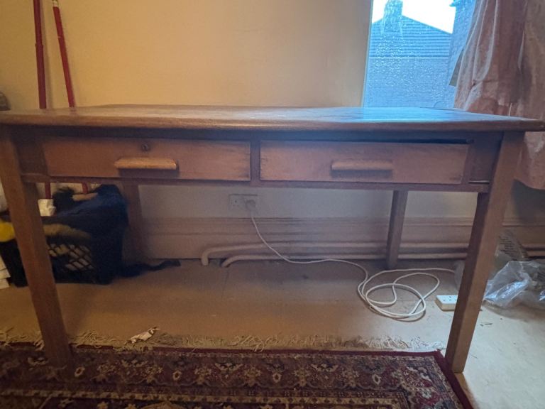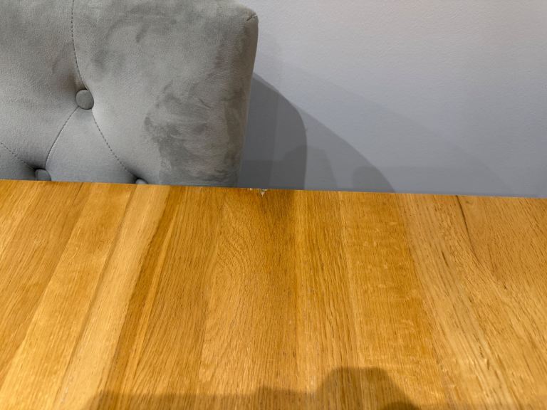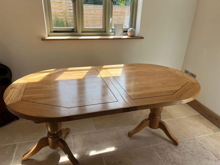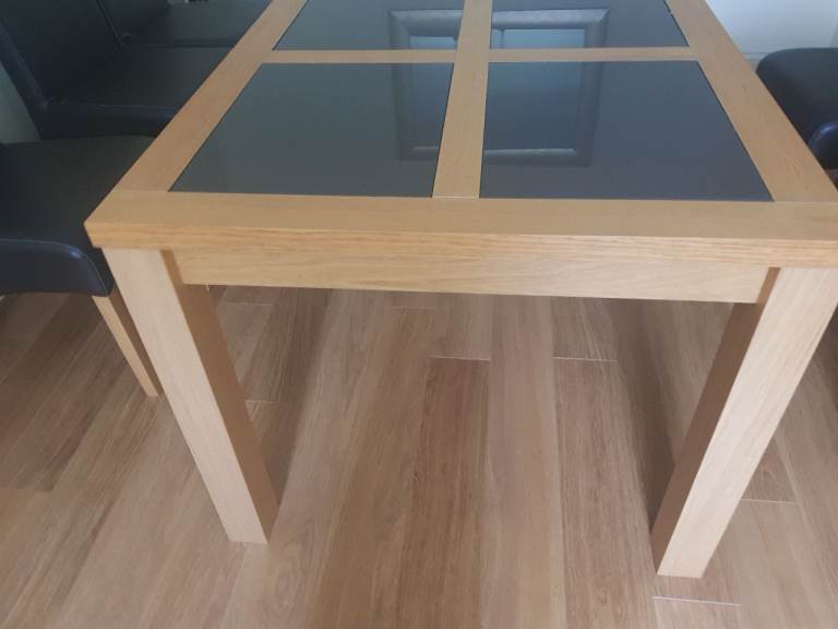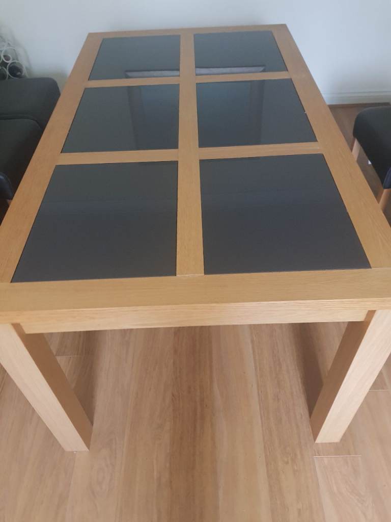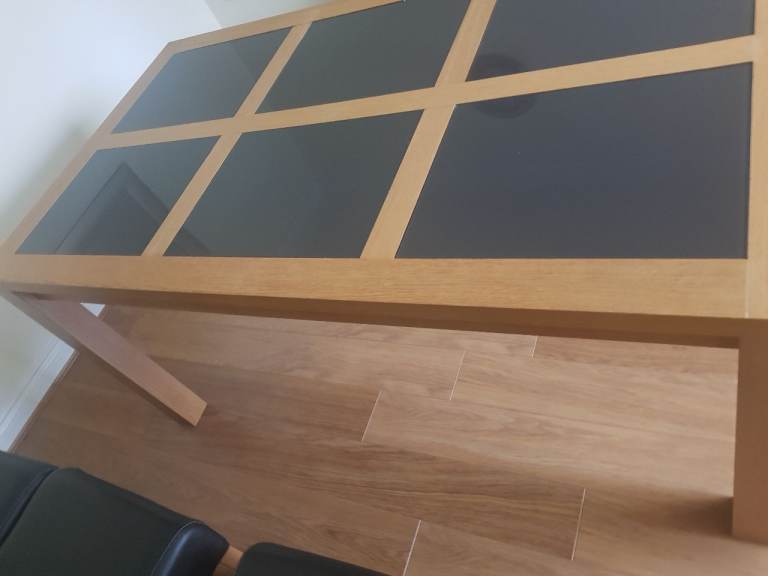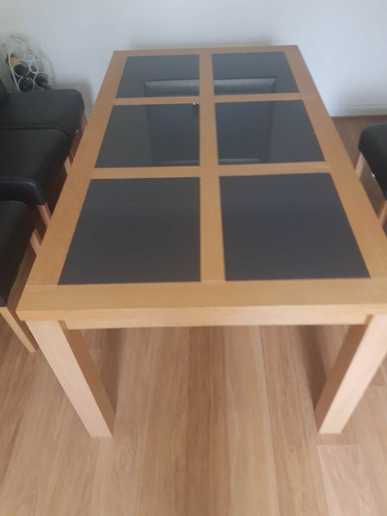 Quality Light oak dining table with 6 black glass inserts which are removable for cleaning. In used good condition, bought from Harvey's. 162 cms long, 92 cms wide and 77cms high. Legs can be removed for transport. Buyer to pick up from skewen area.