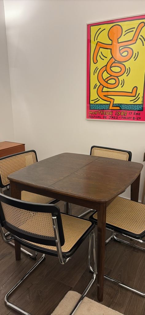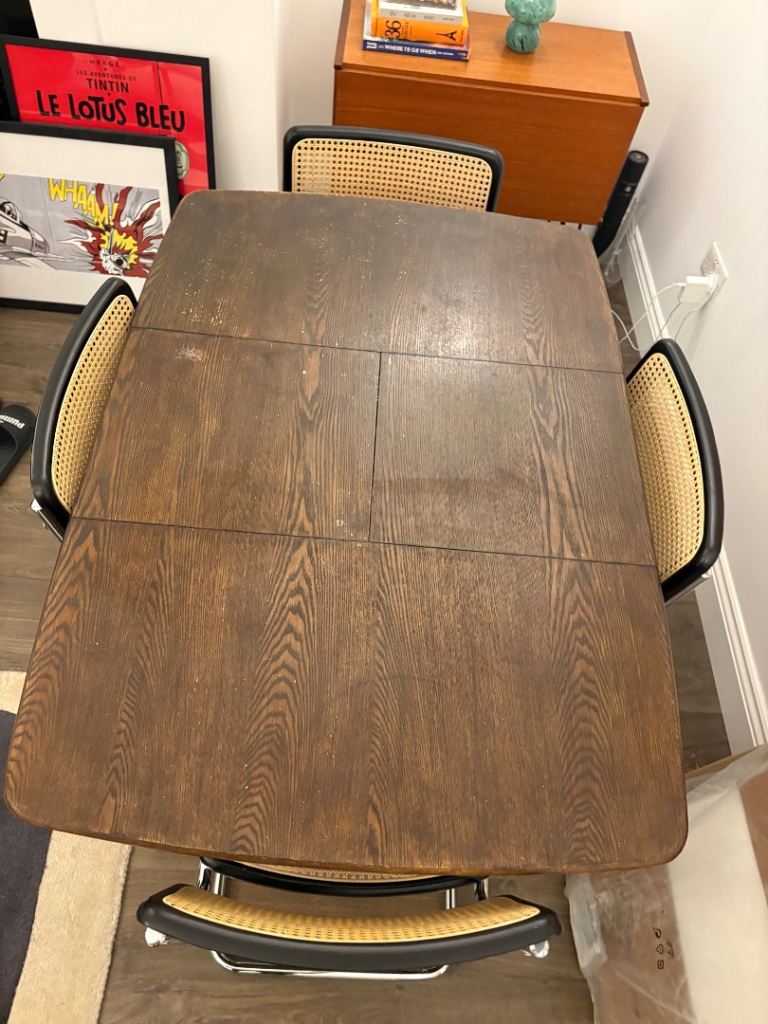 Sturdy, well-made and perfect for everyday dining. There is some visible wear to the tabletop (see photos) – purely cosmetic and reflected in the price. Would also be a great candidate for sanding/re-oiling if you want it looking new again.