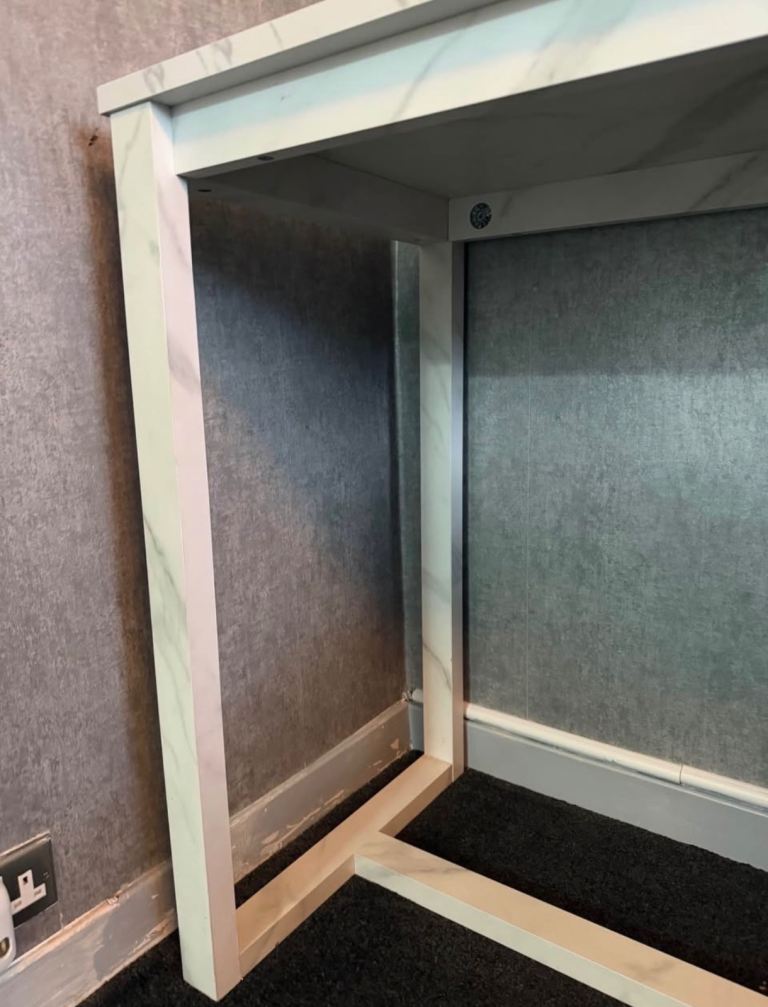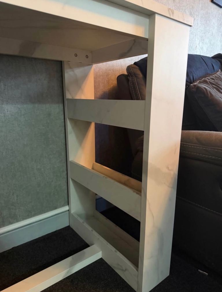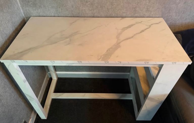 White Marble Effect Bar Table with Two High Stools. High table and long in length, solid base not flimsy and comes with three storage pockets at the side, can go either right or left side.