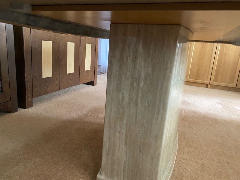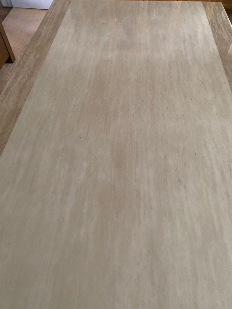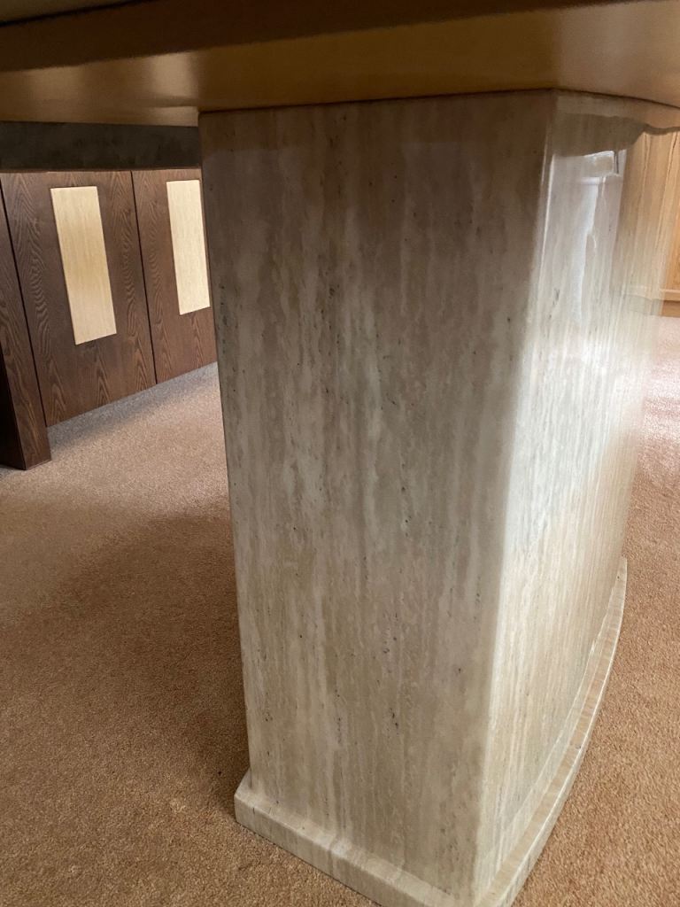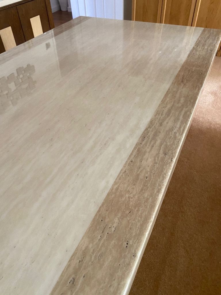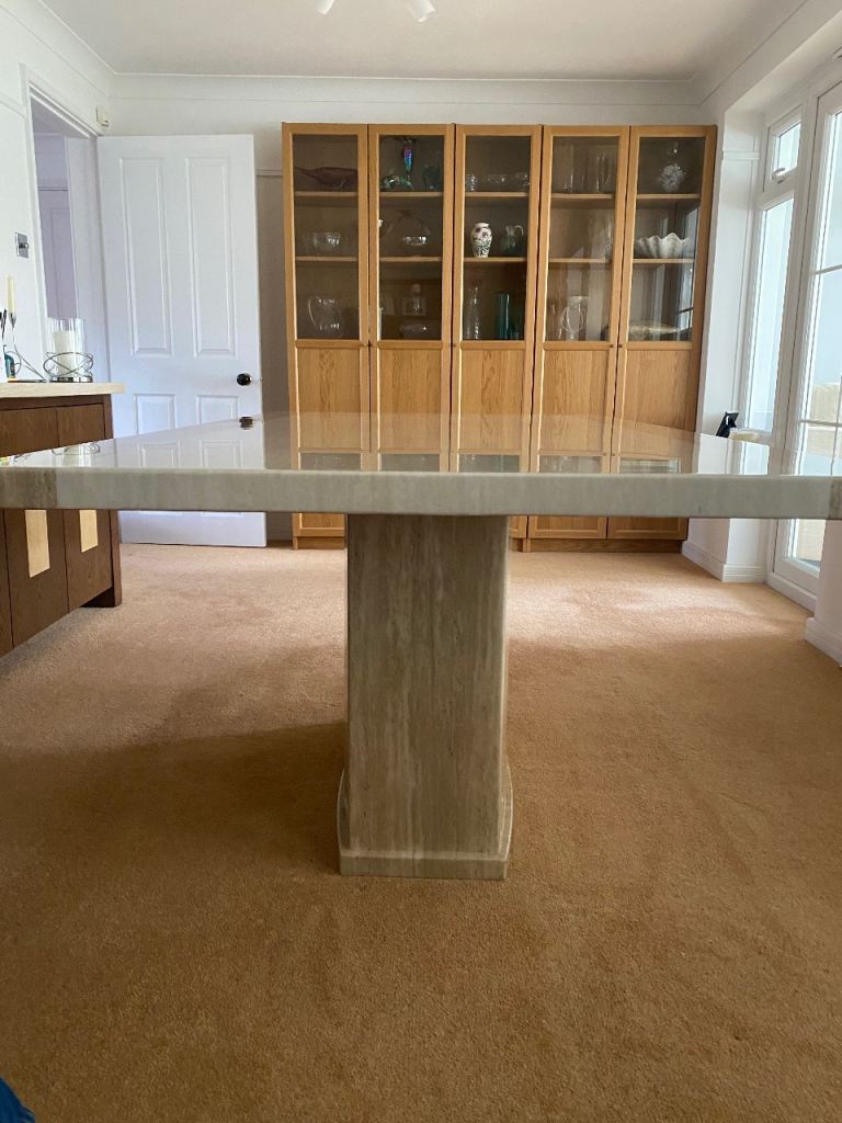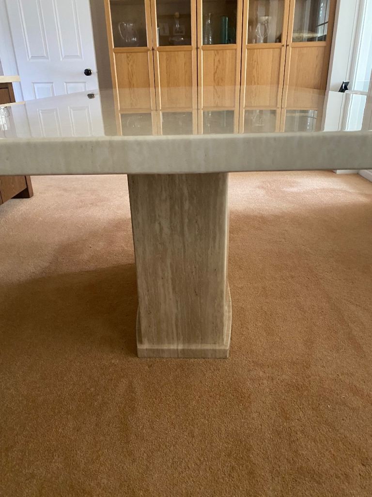 Stunning much loved dining table that will add a contemporary style to any dining area. In two tone cream/beige. Comfortably seats 6 but can accommodate 8. Size 180 long x 100 wide x 77 high cm approximately. Top separates from pedestal. Heavy piece of furniture that requires 2 people to manoeuvre.