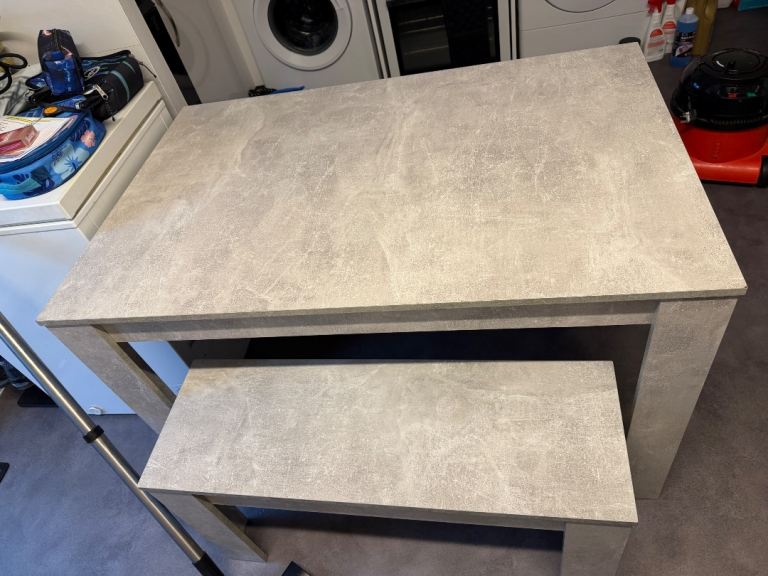 This stunning table boasts a sleek concrete-effect Melamine faced MDF top and sleek metal legs for an irresistibly stylish, industrial look.