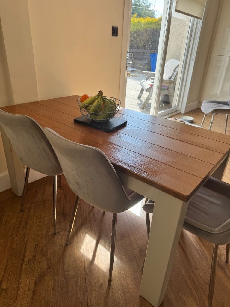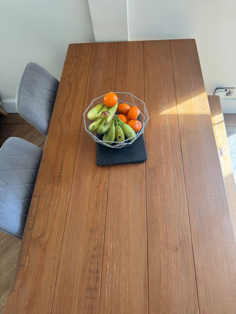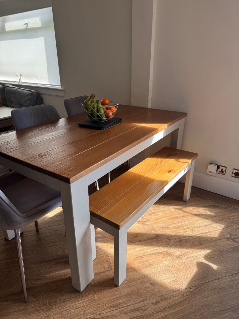 Oak and grey dining table, could be doing with being sanded and stained to make it look like new again. I have another 2 chairs if preferred rather than the bench.