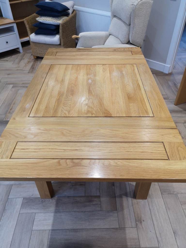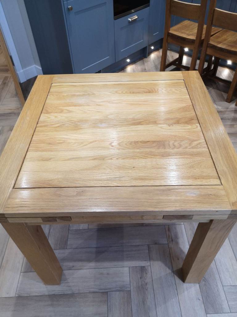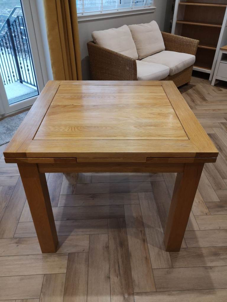 Oak Furniture Land extendable dining table in very good condition. Solid oak. Sits 4 at smallest or we have seated 8 at it when extended but 6 more comfortably. The extra sections fold out from under the table and it is very easy to put them out and in.