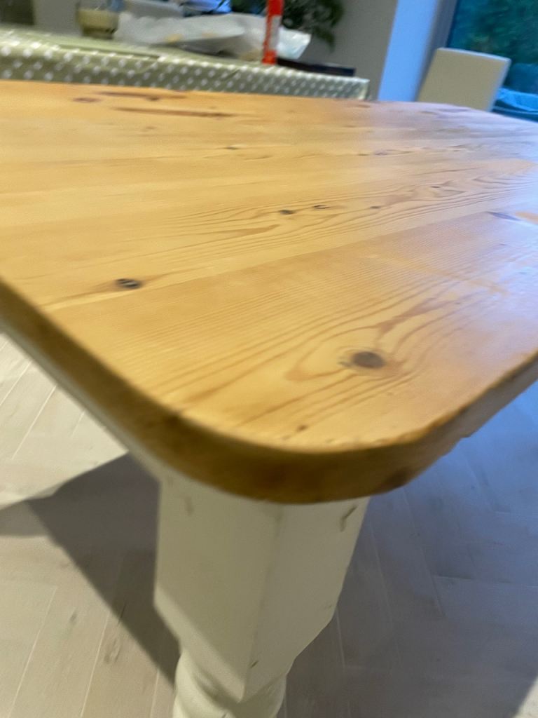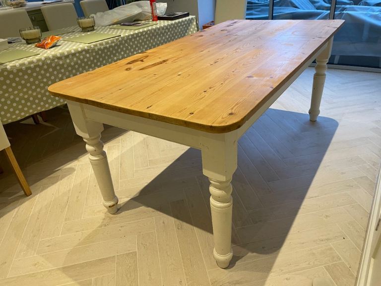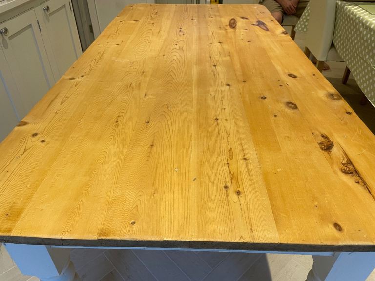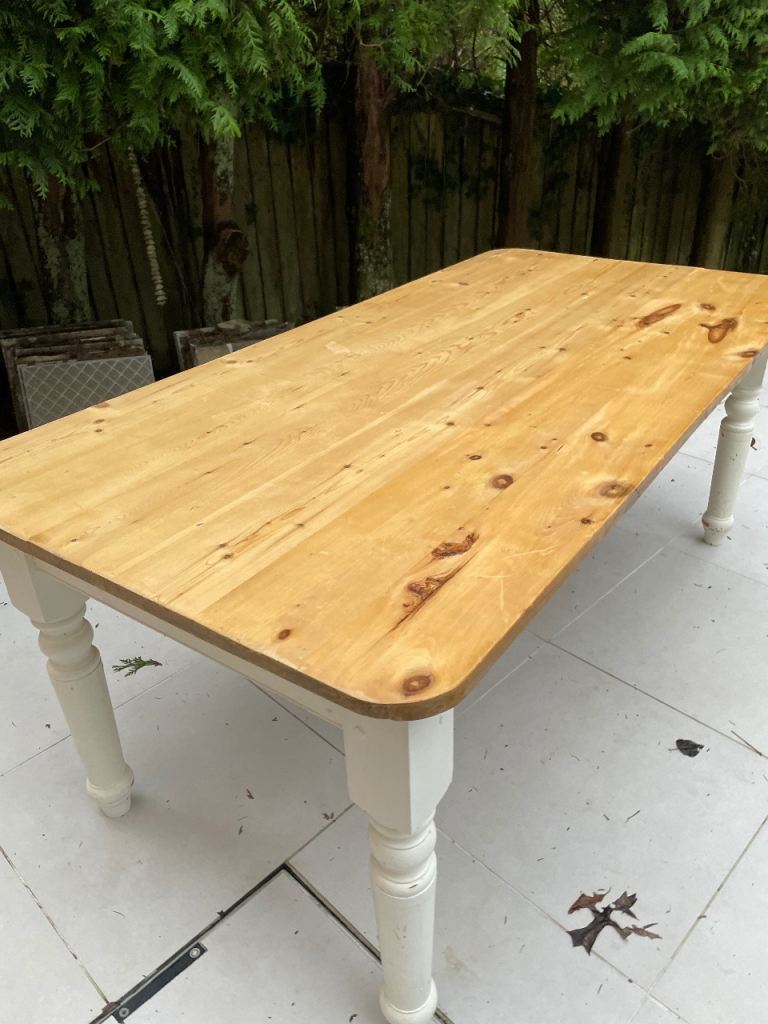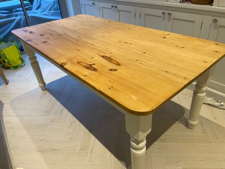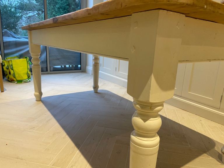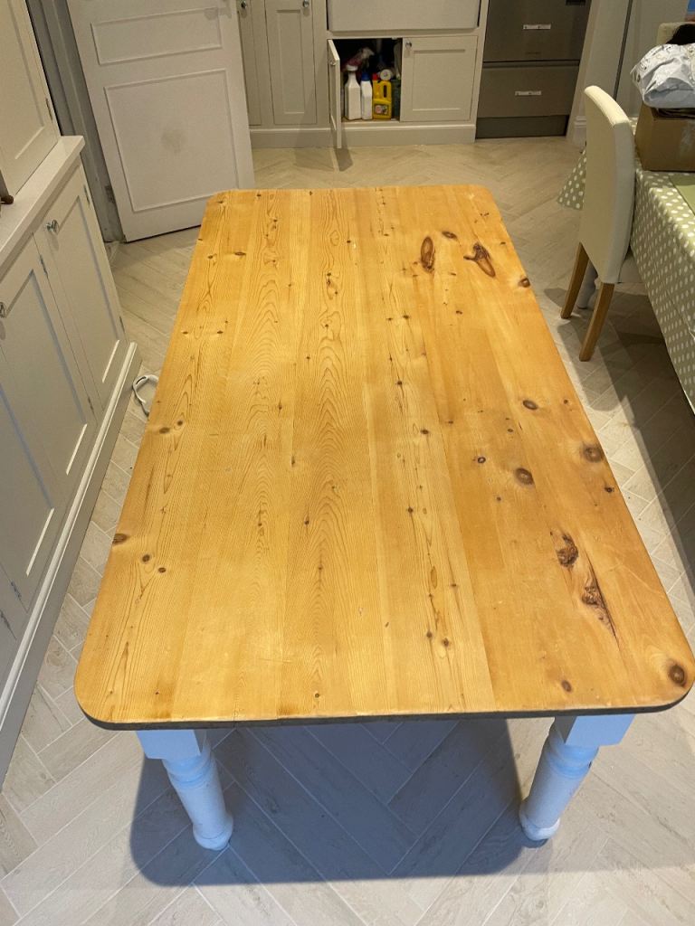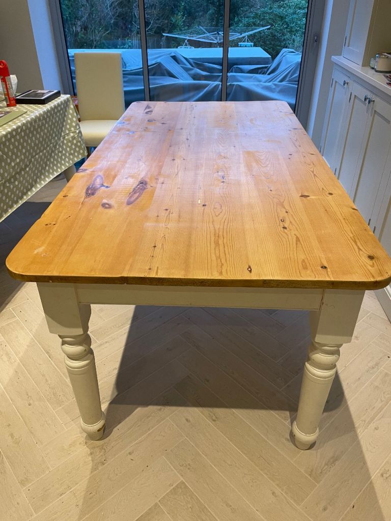 Wooden topped kitchen table. Seats 6 people. Used condition but very sturdy. 1.83m long, 0.91m wide, 0.75m high. Buyer collects. Top is removable but legs are built into the frame.