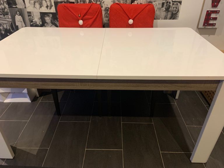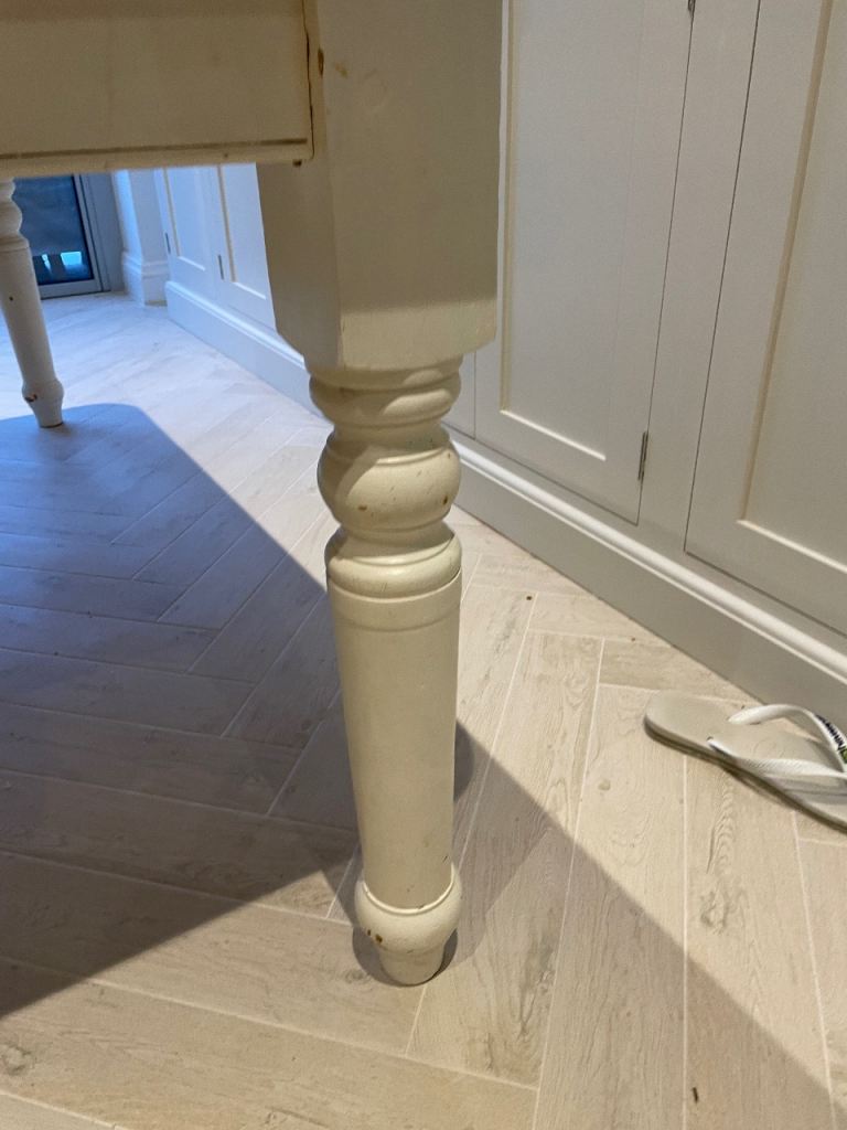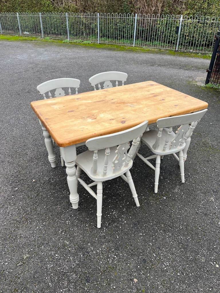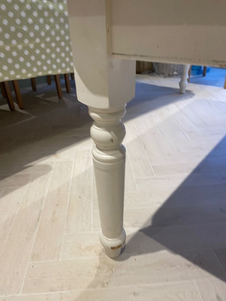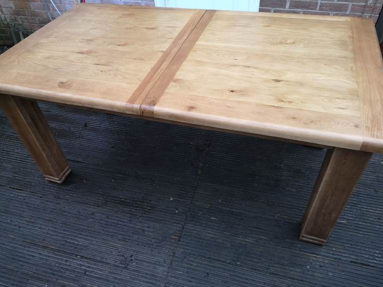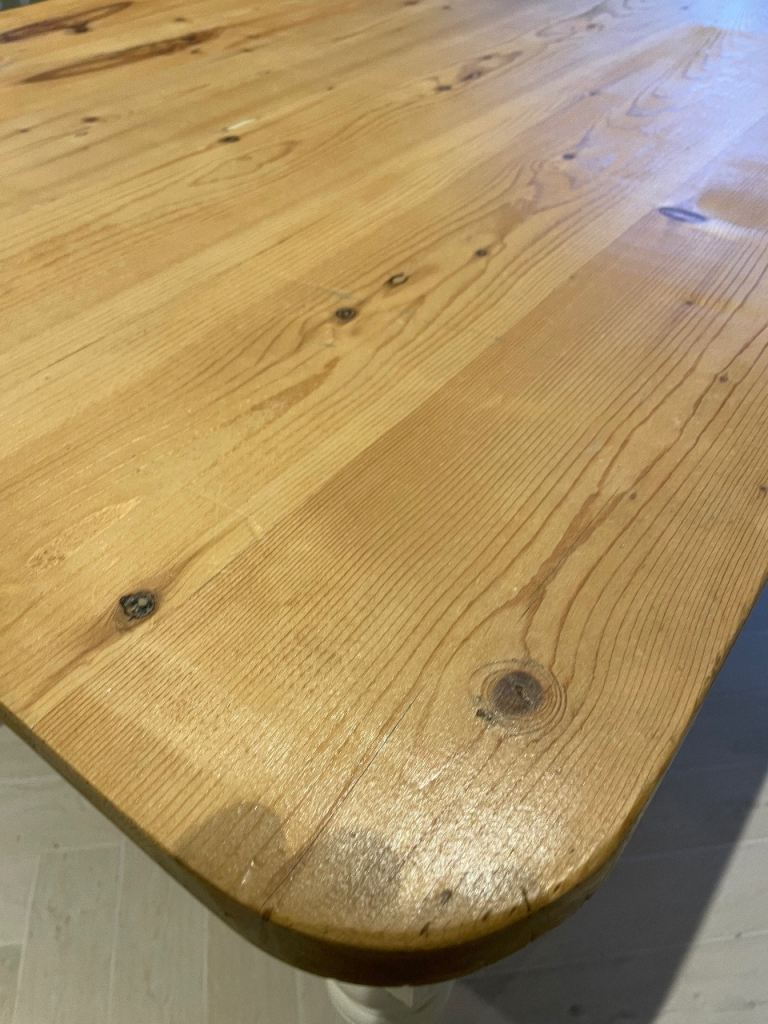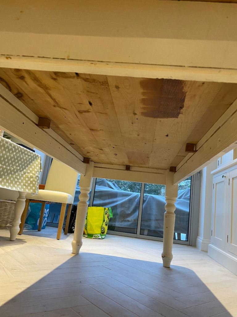 Wooden topped kitchen table. Seats 6 people. Used condition but very sturdy. 1.83m long, 0.91m wide, 0.75m high. Buyer collects. Top is removable but legs are built into the frame.