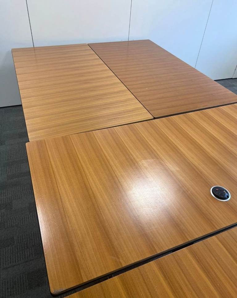 This is a modern high quality walnut laminate meeting table with a silver framework and integrated cable management.