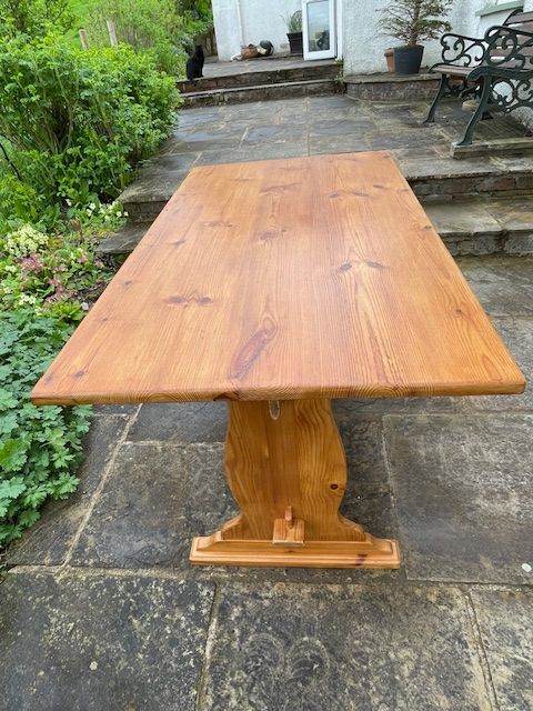 Solid pine dining room/kitchen table. This table consists of two pedestal uprights, two spacer bars and the table top and is easily assembled/disassembled. It has a few minor scratches on the top surface as shown in the photographs and shows some signs of wear but is otherwise in very good condition.