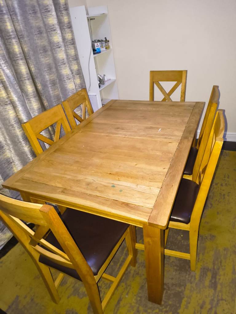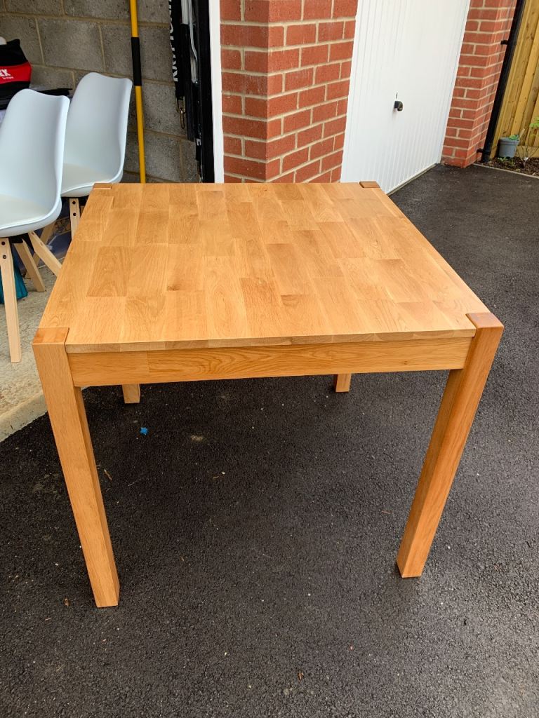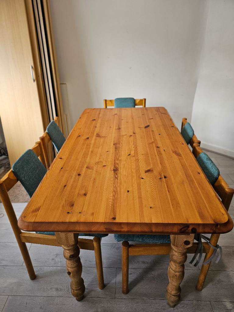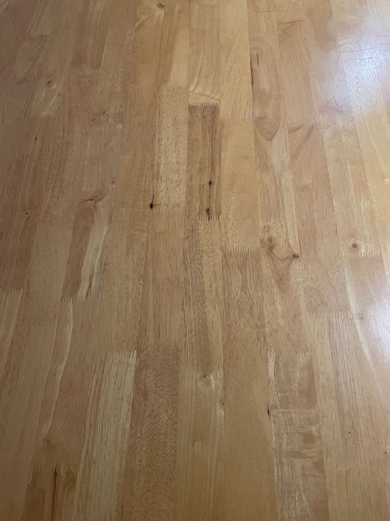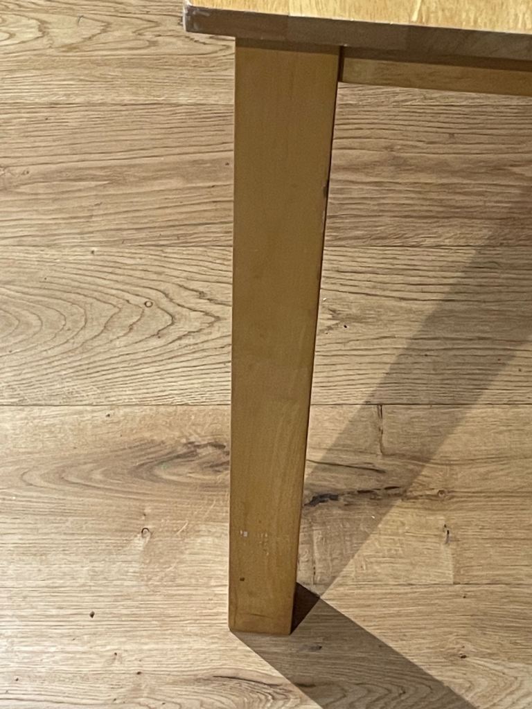 This pine dining table measures 1m50cm x 90cm and stands 74cm tall. It is in excellent condition as it has had protective cover on since we bought it. Photos 2 and 3 show the surface in detail while photo4 shows the style of the legs. Photo 5 shows the underneath and each of the four legs are screwed in with two Alun keys (photos 6 and 7) and have a floor protector stuck on the bottom (photo 8).