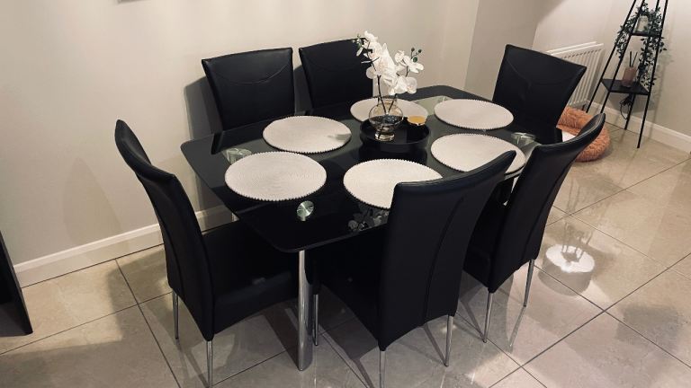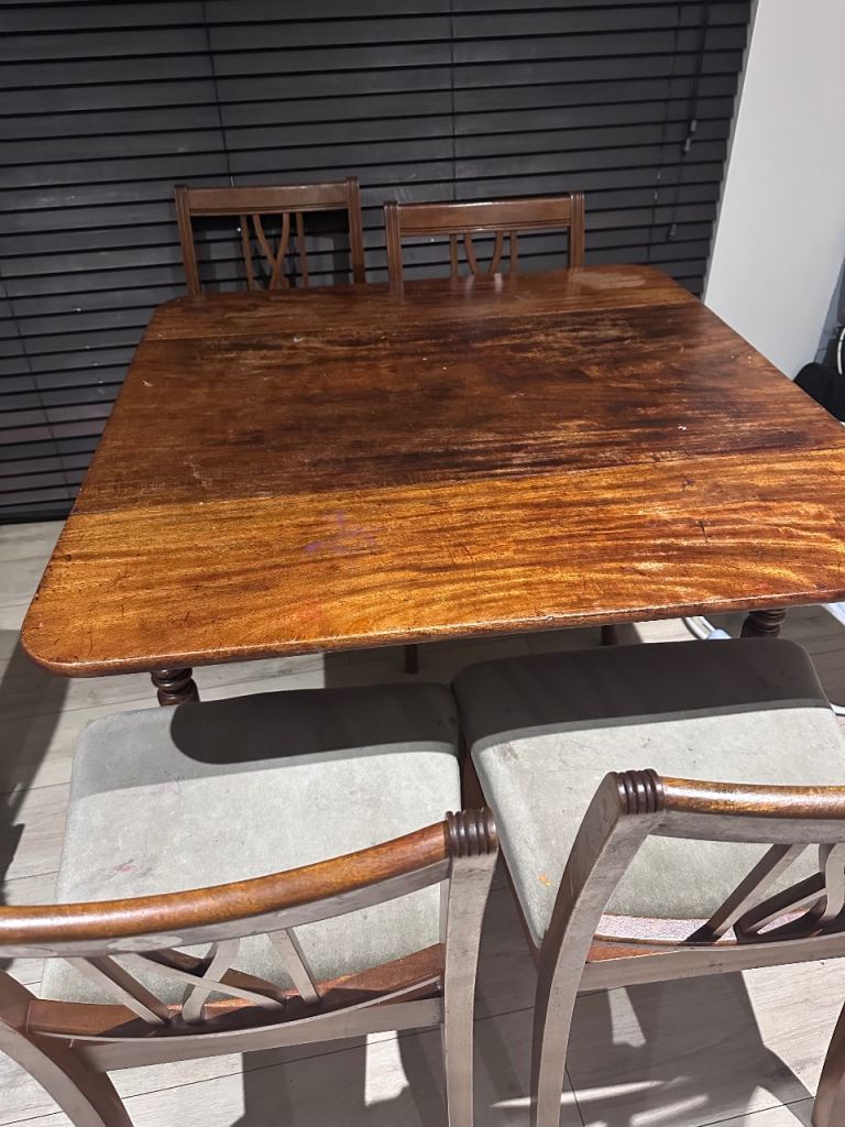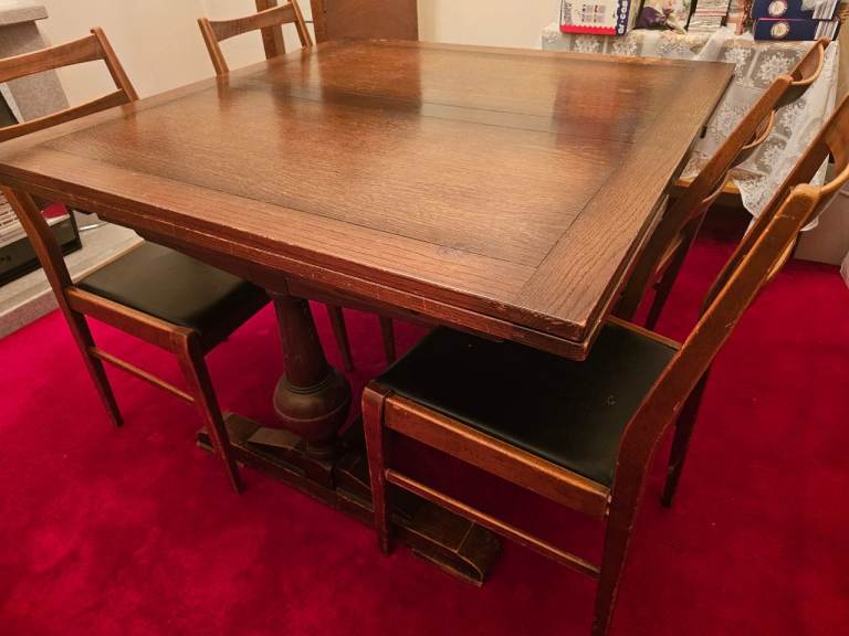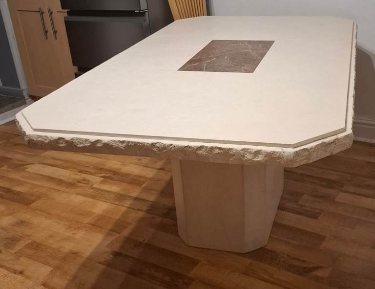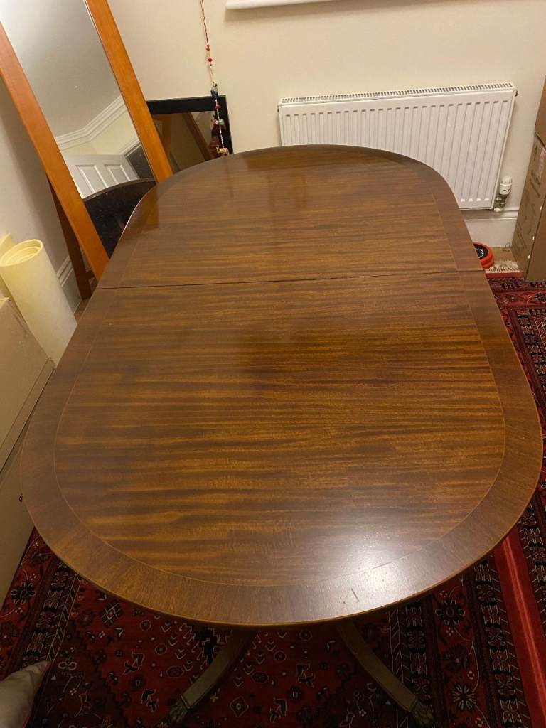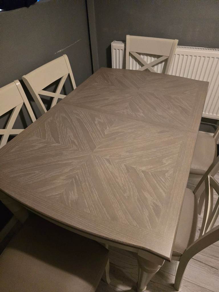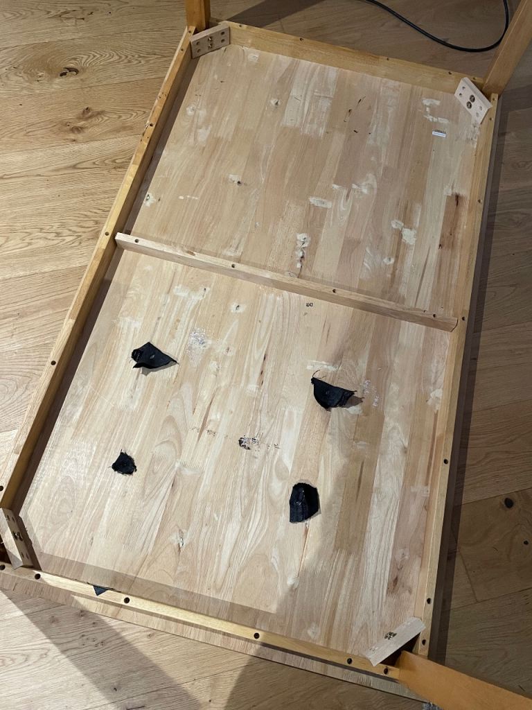 This pine dining table measures 1m50cm x 90cm and stands 74cm tall. It is in excellent condition as it has had protective cover on since we bought it. Photos 2 and 3 show the surface in detail while photo4 shows the style of the legs. Photo 5 shows the underneath and each of the four legs are screwed in with two Alun keys (photos 6 and 7) and have a floor protector stuck on the bottom (photo 8).