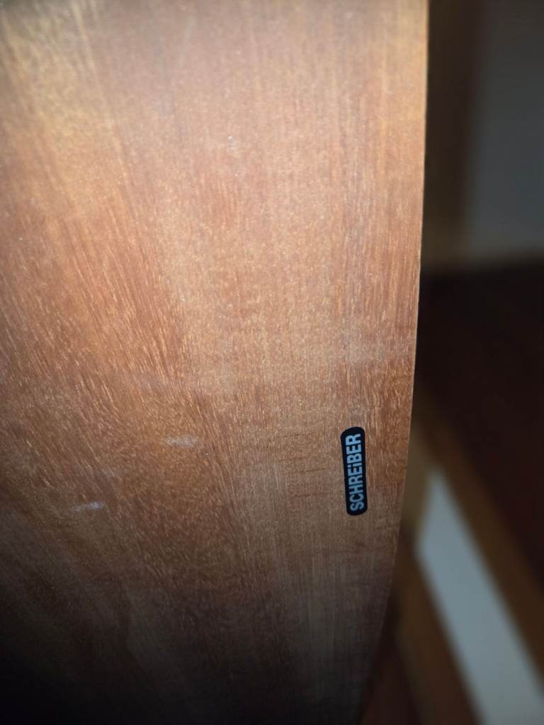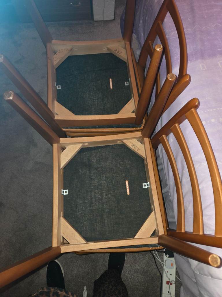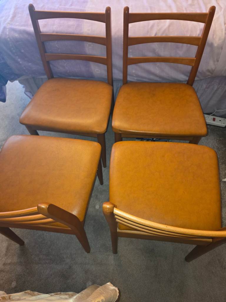 Schreiber drop leaf table bought 1977, 56" long x 34" wide x 29" high in teak wood veneer in very good condition. Sturdy when open and folds to 9.5" wide. 4 Matching chairs in the original padded upholstery in very good condition. Buyer to collect.