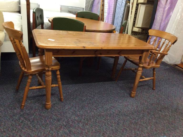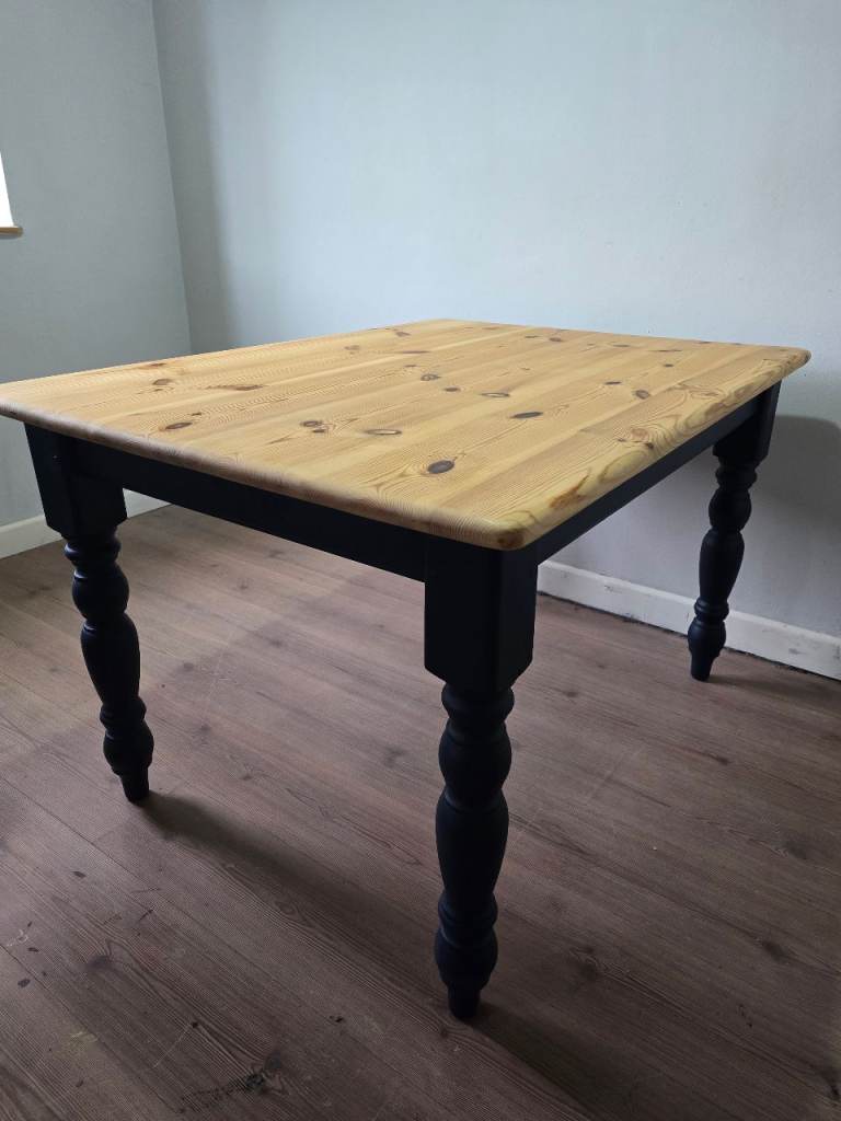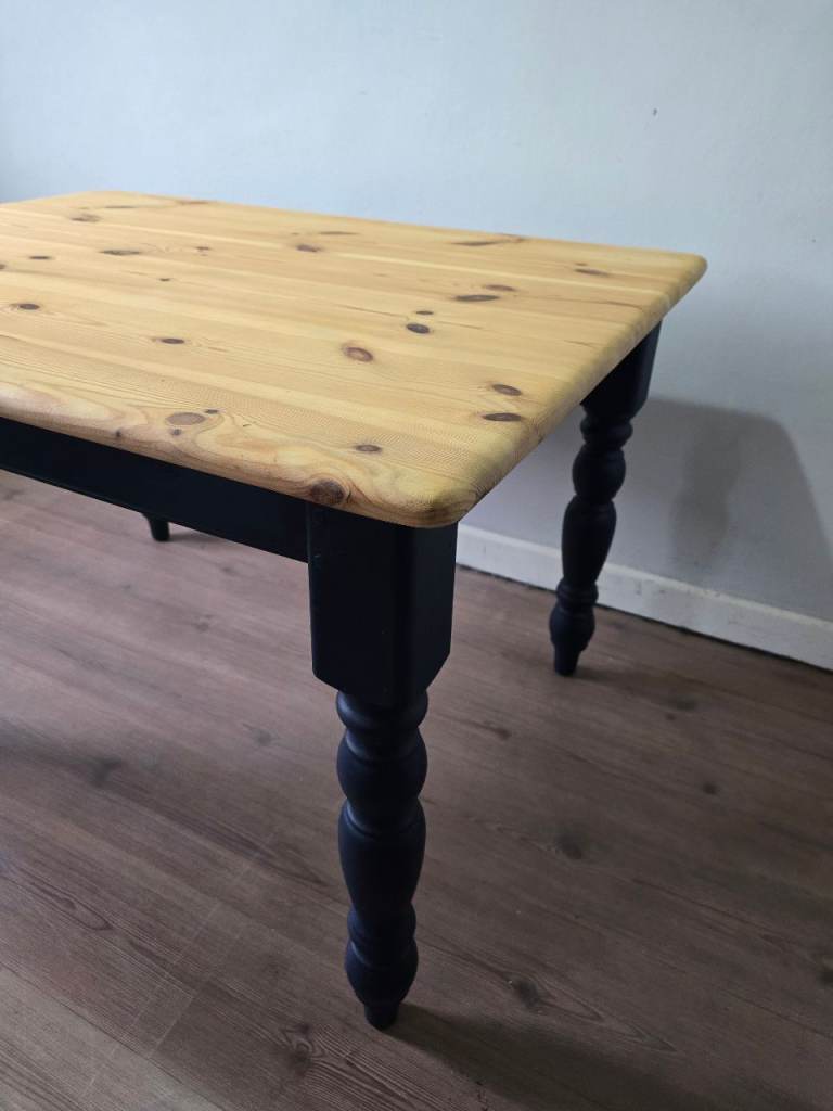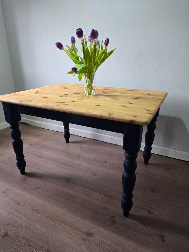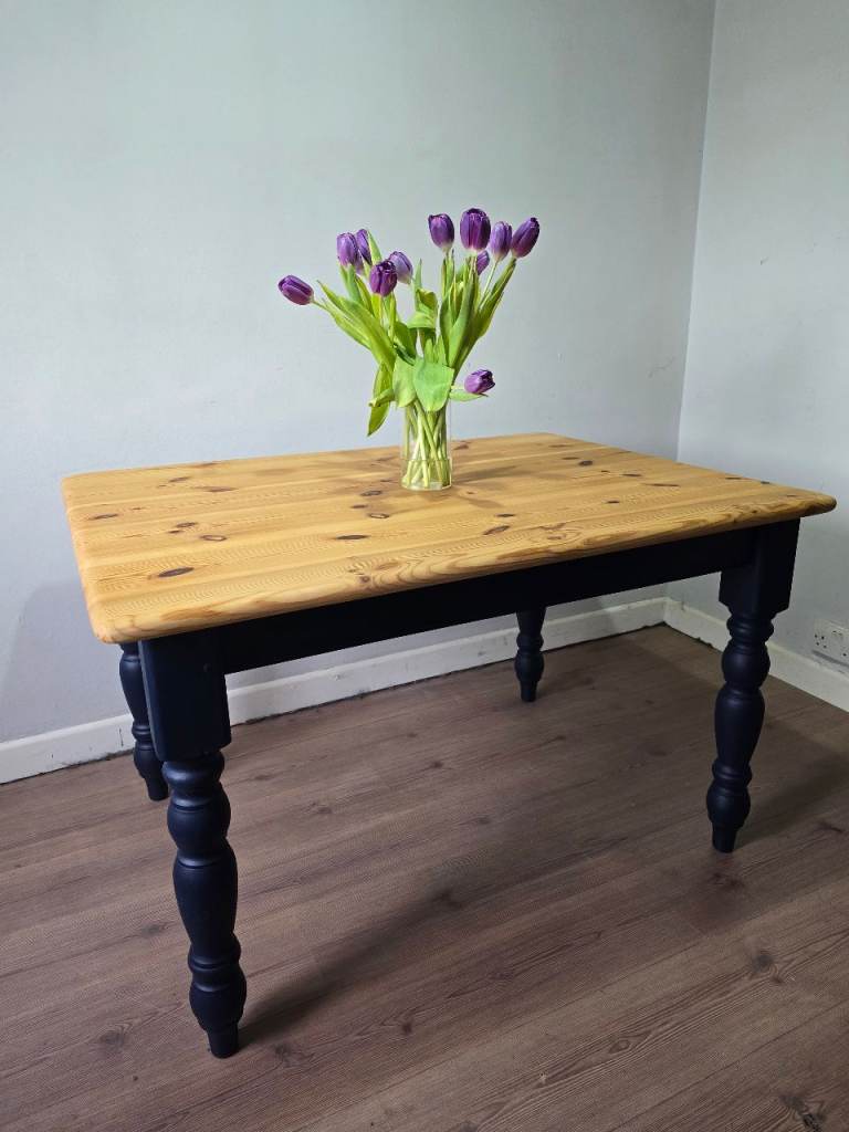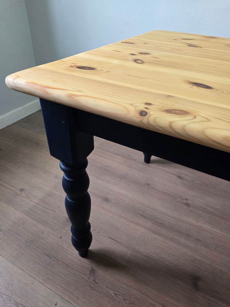 * Solid pine reclaimed & freshly refurbished farmhouse dining table with fixed base & turned legs.
