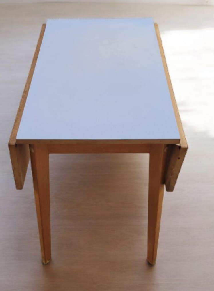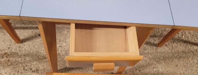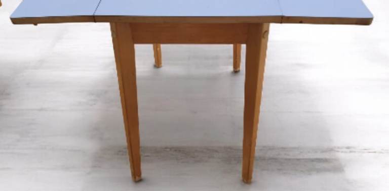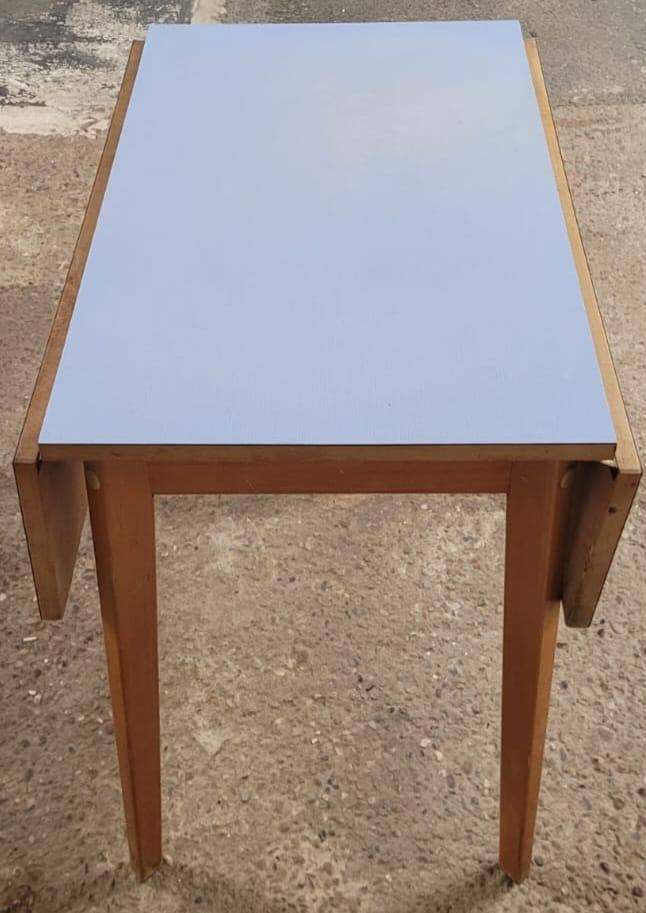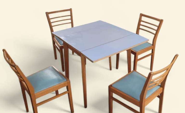 This Retro Blue Formica Drop Leaf Kitchen Table and 4 matching chairs set exudes a charming mid 20th-century style, perfect for adding a touch of vintage flair to your kitchen.