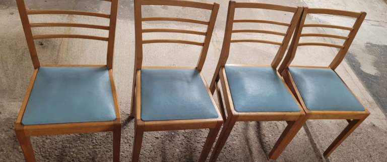 The oak finish on the splied long legs and light blue Formica material give it a retro feel, while the extending feature and space-saving design make it practical for smaller kitchens. With its unique blue colour top and vinyl upholstery, this set is a lovely addition for those who appreciate classic British design.