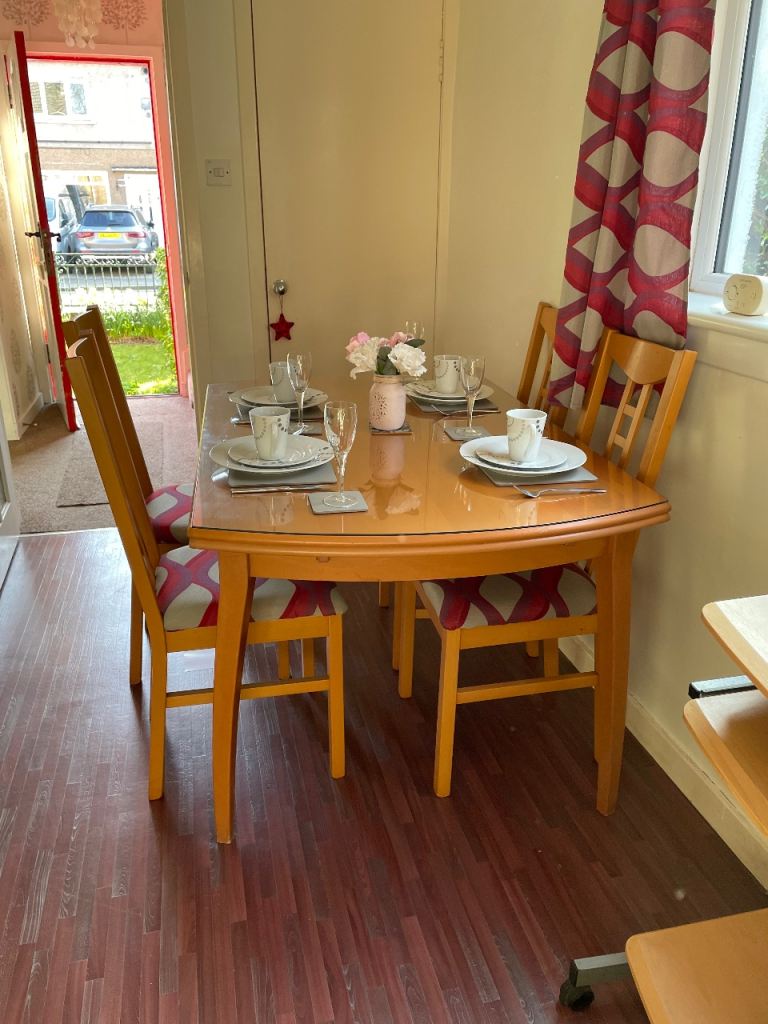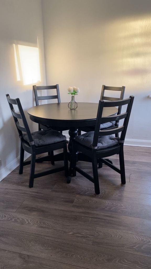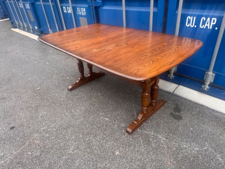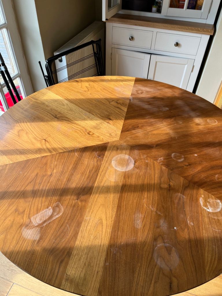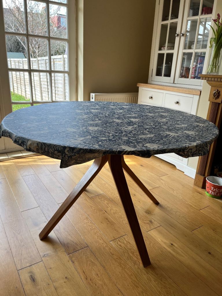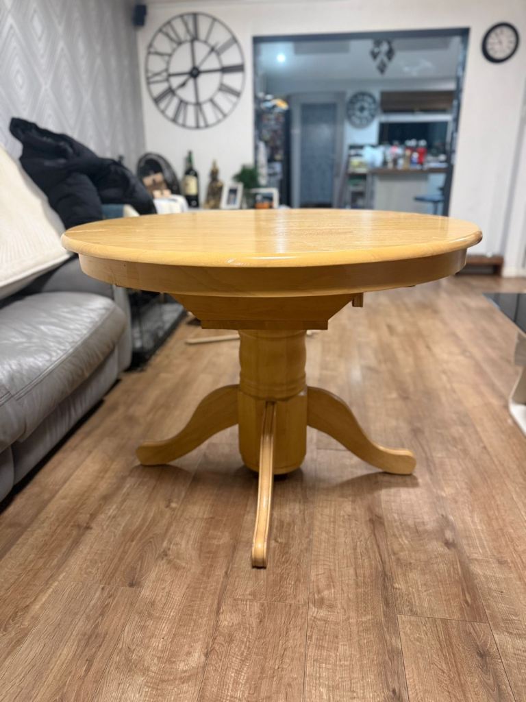 Beautiful round dining table in a warm-toned solid wood with a classic mid-century modern design. Features a smooth circular top with elegant grain pattern and sturdy angled legs.