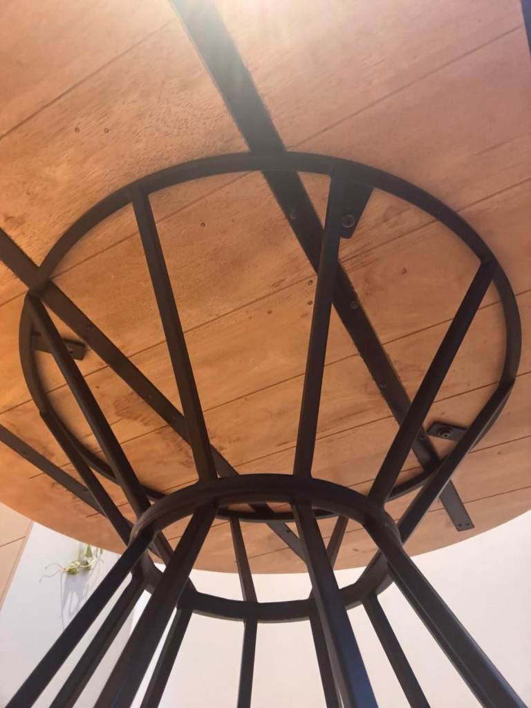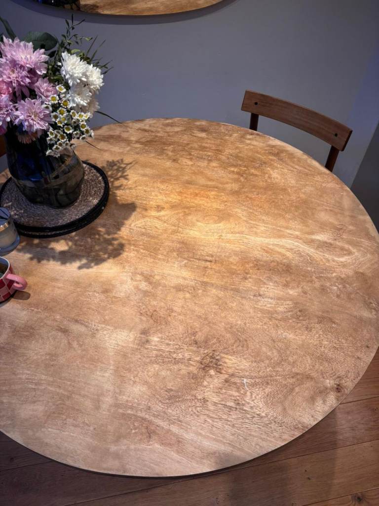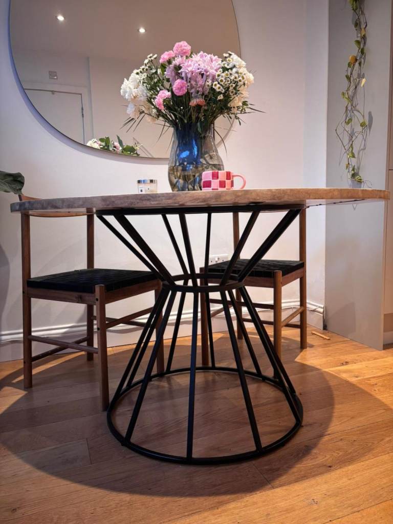 Round dining table in good condition. Some minor marks as seen in photos. One loose bolt connecting the top but this doesn't affect stability. 120cm diameter. Sturdy black, metal base and wooden top. Stylish piece and only selling as we need a different shaped table. Dining chairs not included but may be sold separately if interested. Collection from SE10, central Greenwich (near Greenwich High road). Cash on collection only.